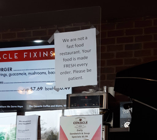 My first visit to Cenacle was in the summer with members of my prayer group. We were happy to find a place open during the pandemic. The decor is warm and inviting and the staff were nice. The five of us placed our orders at the same time. The orders varied from full meals to two ladies who just had a biscuit and the other a croissant sandwich. After 20 minutes the meal orders came out but to our dismay the single biscuit order and sandwich took over an hour. As we sat waiting for the single biscuit order I observed that there were more people sitting waiting than eating or leaving with food. This speaks to the level of staffing and organization of the kitchen. I also suspect that a significant amount of the food is microwaved, not cooked to order (could be wrong). I decided to give the bistro another visit last week and thought I'd just get a coffee beverage. While the restaurant was not crowded like it was during my initial visit I noticed the same - more people sitting waiting on food than eating or leaving with their orders. This time I noticed signs placed imploring people to be patient that it was not a "fast food restaurant" (see photo). The signs were tacky and a disappointment. Displays like this are evidence that customers have pointed out the kitchen organization and management issues that manifest in slow return on orders. The sign shows that rather than listening to customer concerns and quietly addressing them, the management has chosen to deflect issues back onto the customer. I was so disappointed to see this. Its unprofessional and its gaslighting your potential business base into excusing ineptness in your operation. I was also disappointed by my Frappuccino which contained more ice than coffee (in 5 minutes it melted into a snowcone ball with all the flavoring missing). My hope is that they will work on getting the coffee beverages right and out efficiently (that's the first half of their name!) then work on kitchen organization to develop a sound system of getting orders into the kitchen and out on time. I will drop in for a 3rd visit in a few months. Hopefully it will not...