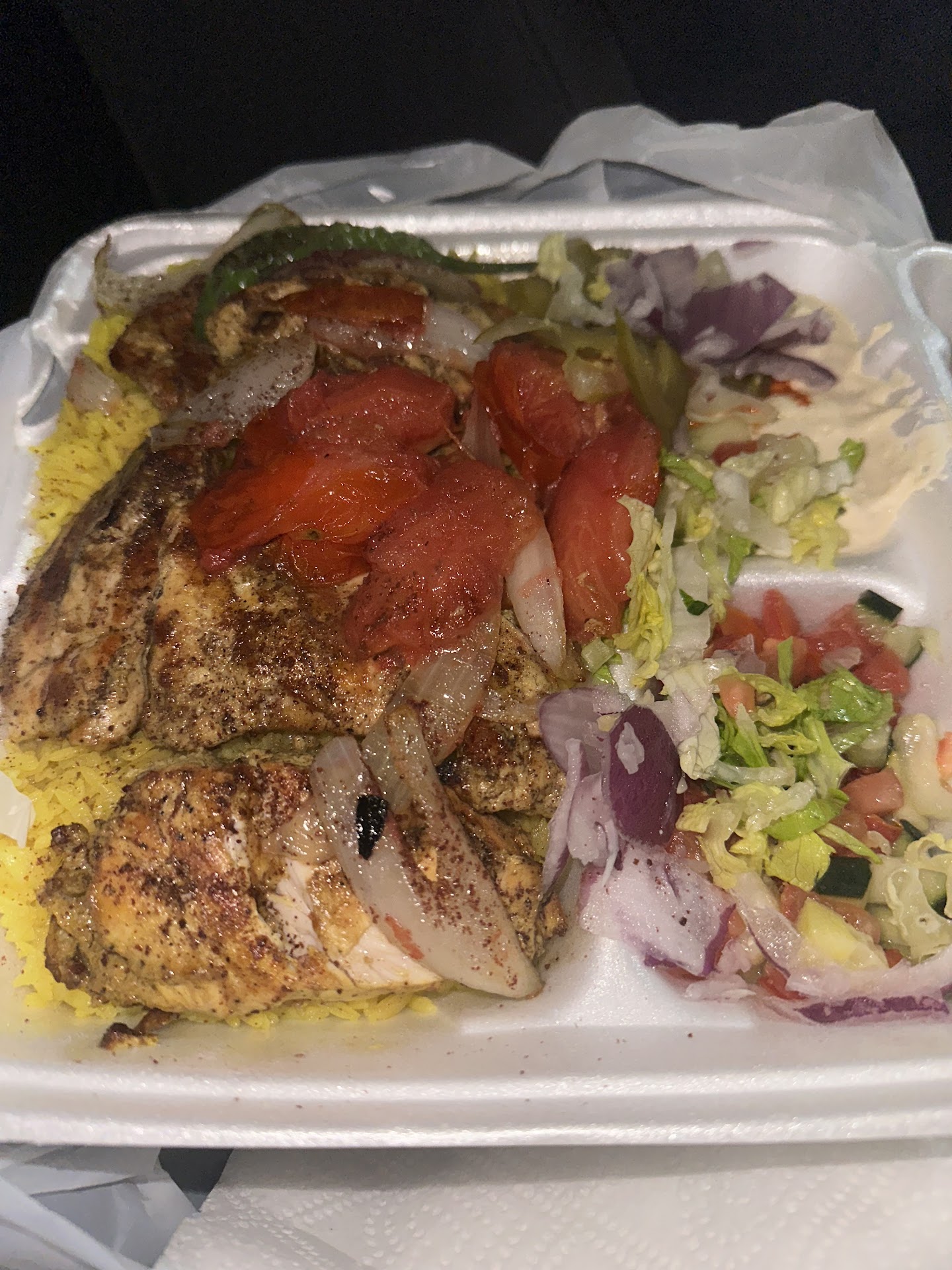 Read moreI came around 8:30pm on a Friday night, and it wasn’t too pack. Based on the menu picture, I ordered the kebab, and the guy told me that the meat was a mix of lamb and beef. I also ordered the tikka, and he told me that the meat is chicken. When I got the food, it didn’t look like the picture in the menu. The tikka was delicious. It came as a plate full of chicken even under the tomato and rice. It had salad, hummus, and pita bread included. The hummus was smooth and had a more charred taste to it. The salad was sour and complimented the chicken. I would get it again since it could actually feed two people. The kebab looked more like a large empanada than what I was expecting. It was good too with juicy meat and tomato inside and cost $10. In my opinion, the tikka was more worth it and cost around $16. There are some tables to sit outside. I also wanted to try the okra, but it...