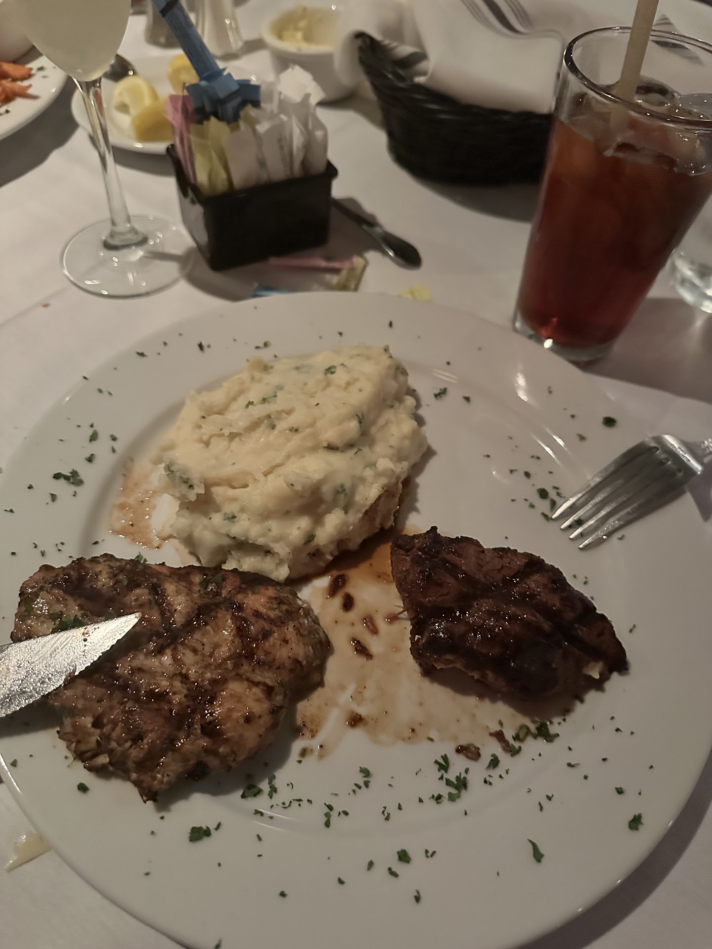 Food: We ordered the Buratta as an appetizer; it wasn’t as lovely as expected to be honest. The cheese was a little too cold and not stringy on the inside. It was good, just would have hoped for a bit more texture and flavour. I ordered the surf and turf, medium-rare steak. The steak was actually rare. Still alright but it was a little cooler than if it would have been cooked medium-rare. The lobster was AMAZING. My partner ordered the filet mignon well done with rice. The rice was delicious, but his steak was medium. Not too big of a deal, but if the kitchen doesn’t serve well-done it would be nice to know beforehand.