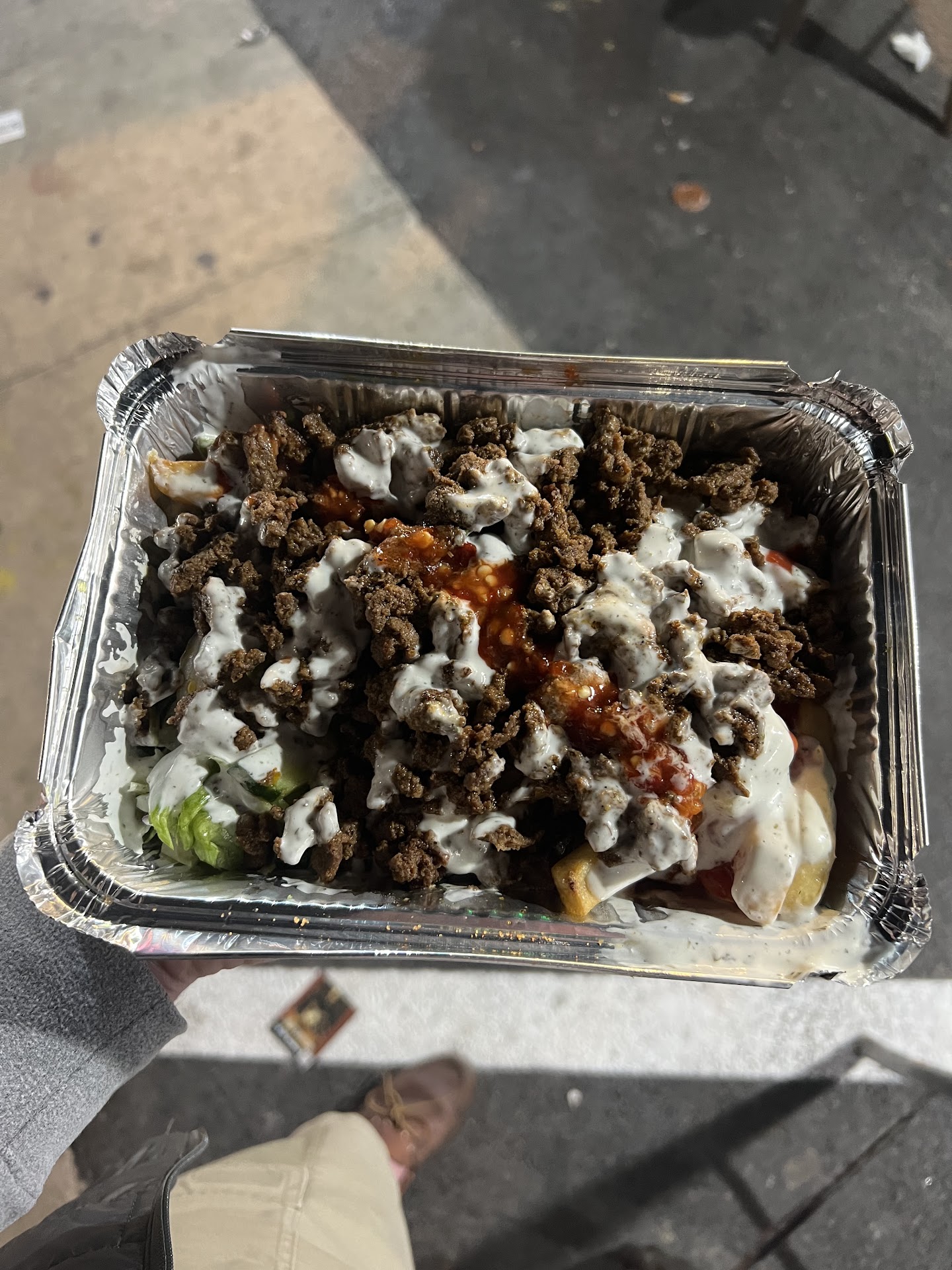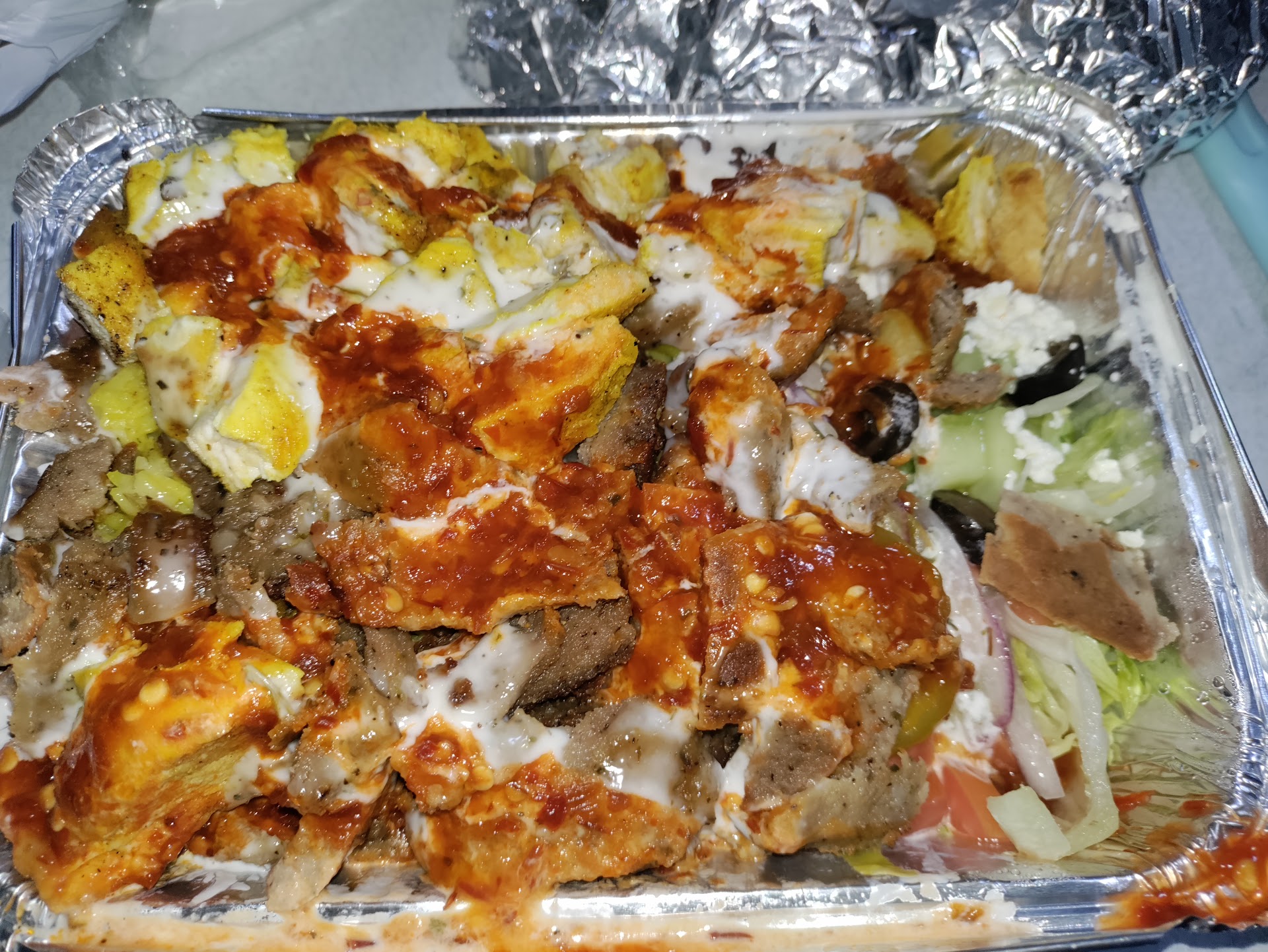 Order took like 10 minutes. I decided to eat in my car because I had a feeling I was going to need privacy. I did! Everything was so good! Super soft pita loaded with meat, veggies and sauce. It was messy and beautiful. The fries were crispy and tasty with the ketchup and white sauce combo. Kind of like the ketchup mayo that you get in south America.