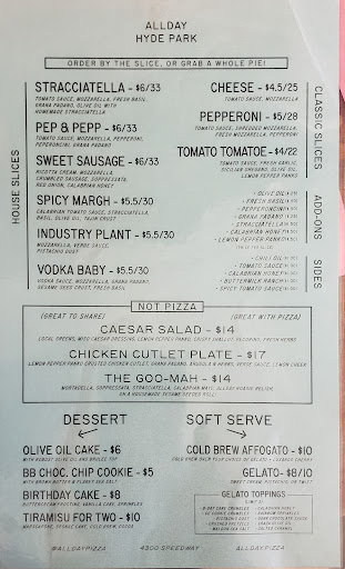 We popped in to try this spot just in time to avoid a line that soon formed out the door and down the sidewalk. Initially, we ordered a slice of spicy margh and sweet sausage, plus caesar salad. Starting with the good but not spot on- sweet sausage slice was excellent in so far as all top quality ingredients but just a touch too sweet for us. The spicy margh was perfection- I love margarita pizza but it can be a little sleepy on the palate. Not this version- snappy red sauce that doesn’t blow you over, but wakes you up to what a complex sauce can be. The dough was impeccable and I will dream of the crust- this is a gold standard thin slice. We ordered a second spicy margh. The caesar was also unique and one of the best I’ve had. It was a bed of mixed greens with a thin, even coating of savory dressing and a nice crunch to the toppings that were easy to incorporate in the oversized serving bowl. This salad is satisfying enough for a light meal- though skipping the pizza may be a papal sin & be careful with that since the pope is a now a “local” boy. Split the salad & eat the pizza! Finally, we split a cold brew affogato and it’s good I don’t live within 3 blocks of Allday or this would be an everyday treat. The soft serve isn’t too sweet and the cold brew is stout- together they create a decadent combo. As you dig a couple bites into the cup the texture becomes an almost slushy, which is simply delightful.