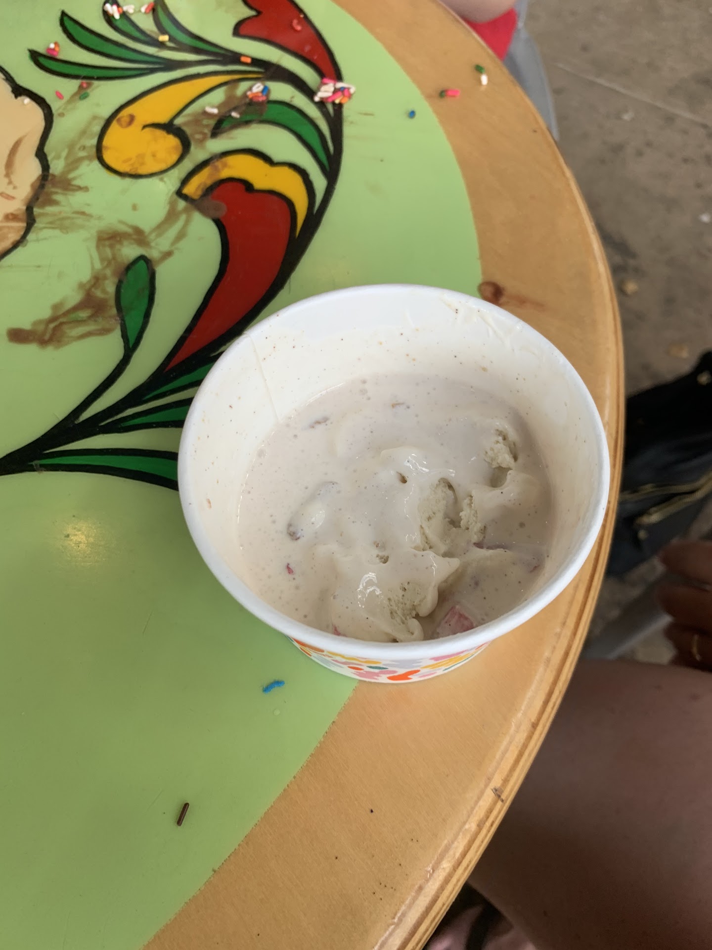 Amy has a lot of options in stock (stock options)—both ice cream and toppings—and her Counter Girls are cordially accommodating to inquisitive ice cream samplers such as us. My dear companion was still undecided after all her samplings, so she simply said “surprise me” and was indeed pleasantly surprised with a mystery ice cream which we believed to be Watermelon with Oreo ore. I admired my dear companion’s faith in Counter Girl No. 1, but my intuition was urging me toward American Apple Pie ice cream with pecans. Praise Allah = Thank God for Counter Girl No. 2, though, for she suggested a warm drizzle of pecan praline instead, a delectably appropriate and superior substance which I would not have known existed if not for her. Suffice it to say, the Counter Girls did right by us. I say this even though CG#1 inverted our cup sizes—giving me the “small” and my dear companion the “tiny”—because that actually worked out for the best, as the scientific consensus soon emerged clearly declaring mine to be the certifiably superior creamy concoction.