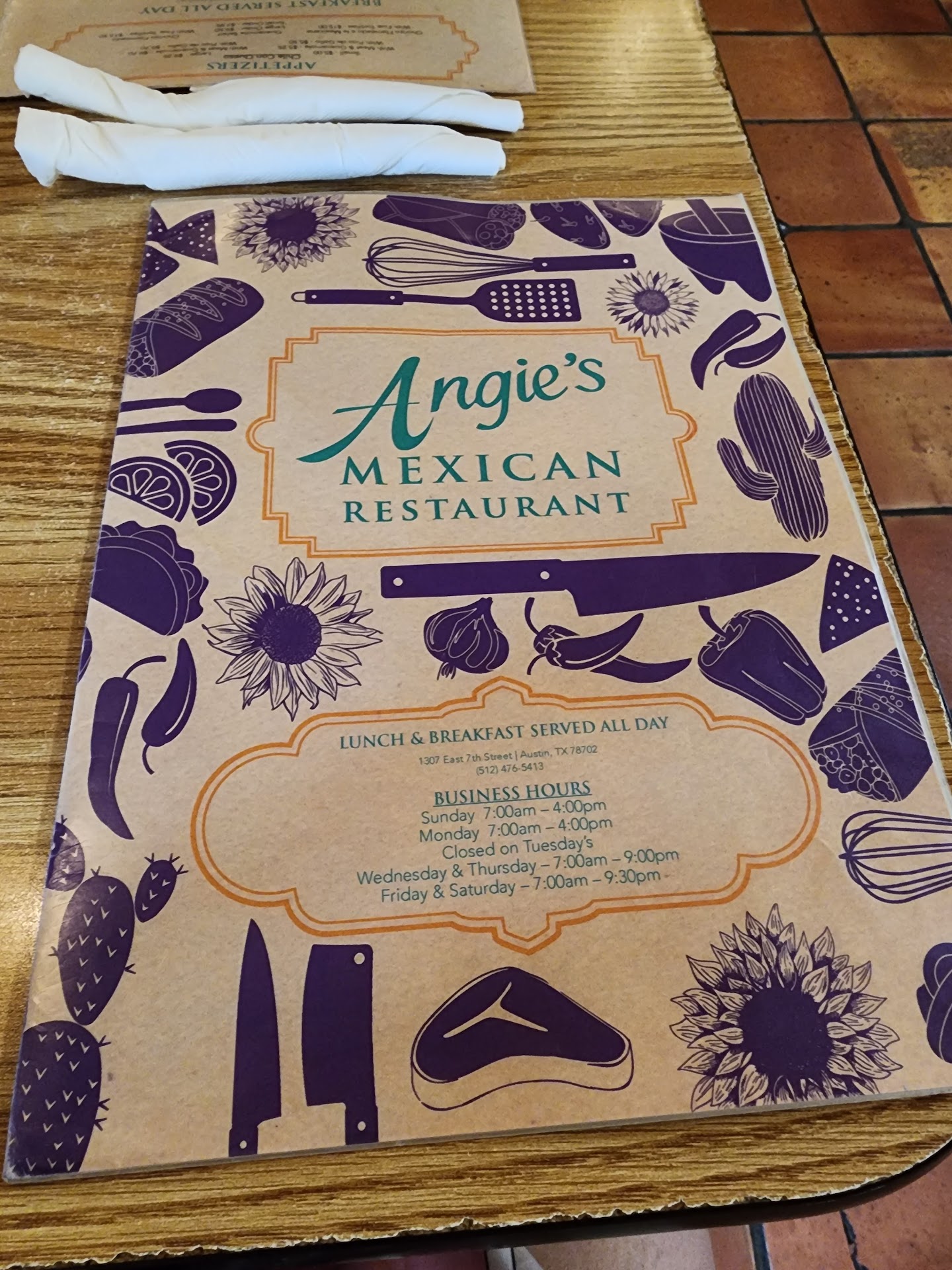 Breakfast on point! After fighting the crowds at all the local hippy places I finally gave up and came to this diamond in the rough. Parking was a bit tight but that didnāt deter my belly. Once inside I felt right at home. The waitress let me sit where I wanted and as soon I did she brought over some of the spiciest salsa and chips I have had in Austin. I love my salsa a little thick and this didnāt disappoint. Of course I came for breakfast and not the chips and salsa. Working my way through all of the options I chose to go the taco route. I was torn between the chorizo and beans and the beans and egg or the potato and eggs. Geez what was I to do? In this situation I did what anyone should do. I ordered all three and an extra potato and egg for good measure. Did I want coffee ? Yea ,why not, when in Rome. The tacos came back after a few mins wait and I dove right into the potato and egg. Great flavor and brought back memories of my moms papas (potatos) and eggs. The flour tortilla was a little over done but had just the right fluffiness. I wonāt die of a little scorch. Next, came the chorizo and egg. I must say I wasnāt a fan but I had to try for myself. I think it needed a little more spice but hey I love the heat. Finally came the bean and eggs. I was excited since i was ready to see if these beans came close to my great abuelitaās. Scoreeee, yes I am a fan. You can tell an old school cook by their beans. Beans, had just the right amount of fat and the smoothness of the mash was the perfect creaminess. After 4 tacos I was ready for a nap. I recommend Angieās for breakfast for sure. As far as the other dishes Iāll be back soon to try them out. Until then, Angieās you have a...