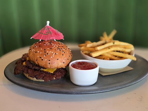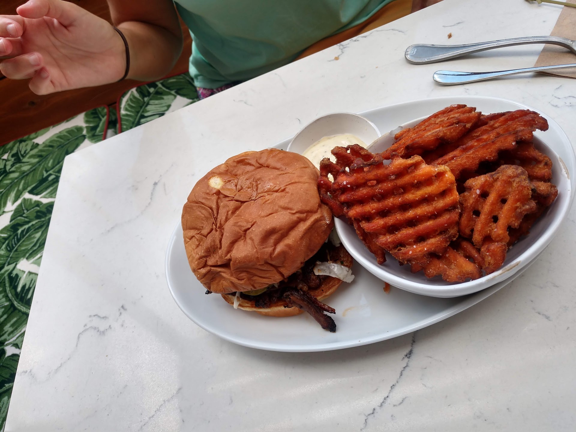 Hilo Hawaiian Sandwich ($19) + Roasted Cauliflower ($2): Chopped brisket on a King's Hawaiian sweet bun with sesame slaw, French-fried onions, garlic dill pickle chips, kimchi aioli, pickled okra, and your choice of side. It sounded better than it tasted. The brisket was really dry. We thought the cauliflower side would be the same as the Char-Buff Cauliflower, but it wasn't. These were actually charred...