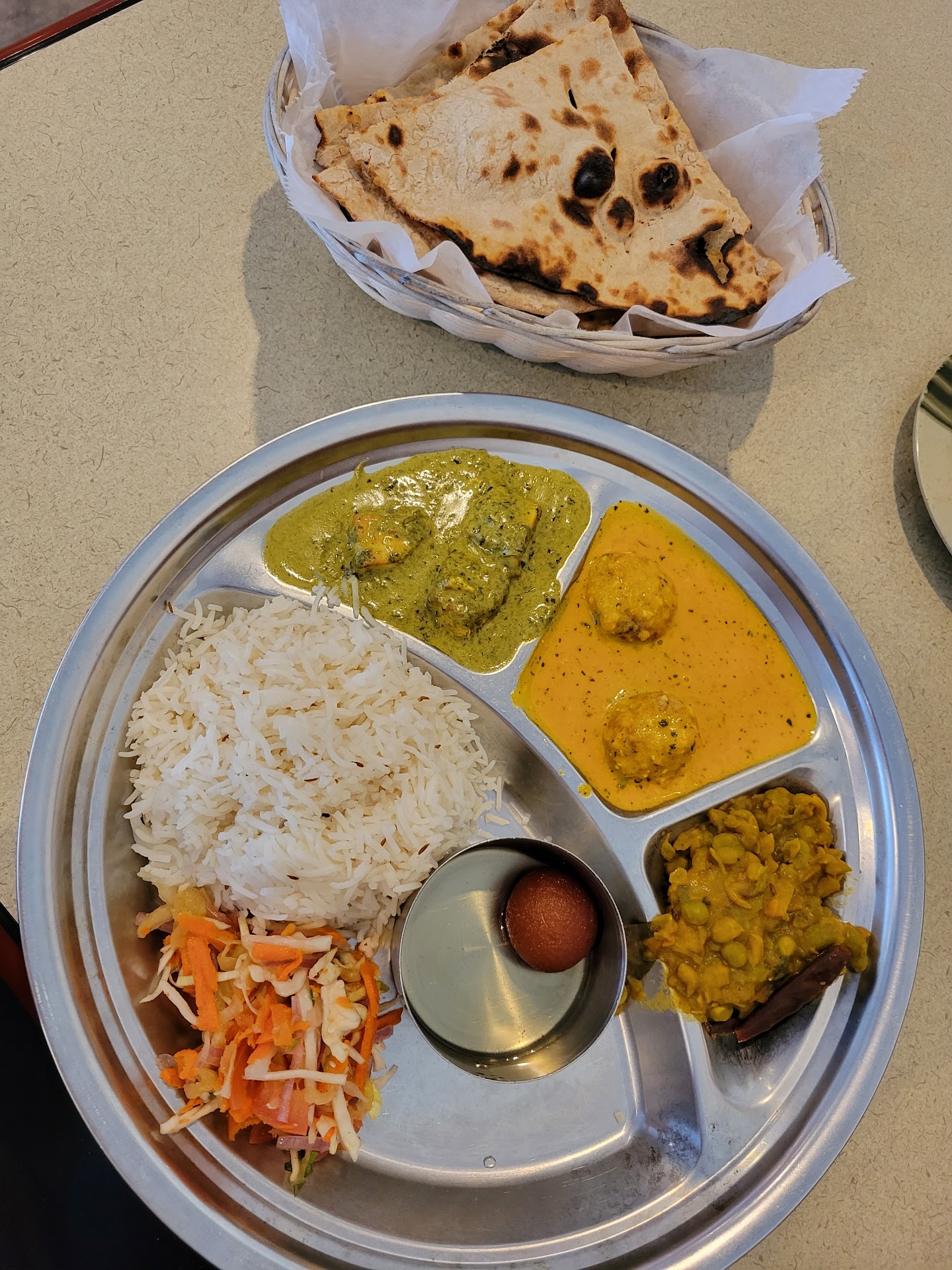 Dishes ordered: Samosa - not worth ordering! I only tasted super salty butter flavor? The dough was not right and the cilantro & tamarind chutneys were just no good. Malai Kofta platter - the saag paneer was my favorite but even the paneer was not as fresh as I would like. I couldn't finish the lentil/veg side. It just didn't taste right either. I got roti instead of naan and it was fine, again missing the classic Indian roti perfection.