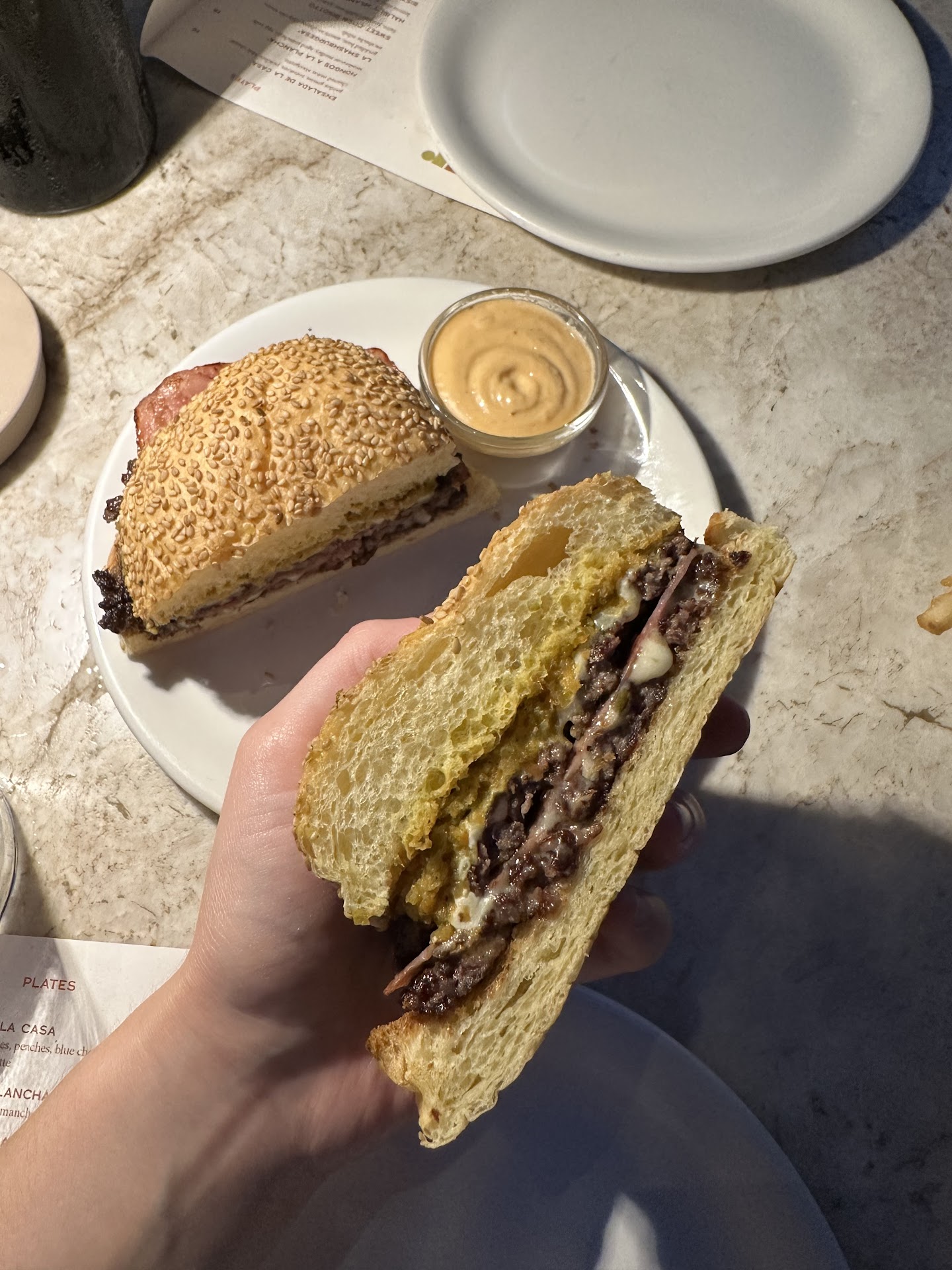 We went to Bar Toti to try their all night happy hour on a Monday and it made for a lovely night! It is a small space, very intimate and cute. We sat outside at first before moving inside because of weather and both areas had a lovely ambiance. About the food - I’ll go into detail about each dish we got and why I gave it 3 stars. The hongos a la plancha comes highly recommended from both reviews and staff, however I wished I had gotten something else after trying it. The mushrooms that we were served were not the meaty, scored ones shown in other photos, ours looked and tasted overcooked and were swimming in oil. I don’t think this dish fit my personal tastes as it was mostly just very oily and rich, so if you also dislike those flavors, I don’t recommend it. Also, the burger didn’t live up to the hype for me, as I had heard it was one of the best smash burgers in town and it unfortunately was not a standout to me. I appreciate its uniqueness and the happy hour deal, but it was not exactly well executed - the bun took up most of my bites, it had an overpowering mustard flavor, and I could barely taste the ham. I’ll give them the benefit of the doubt because many other reviews rave about these dishes, so they could’ve just had an off night! We ordered the fries and the focaccia as well, both were good and the focaccia was beautiful but over-salted. The overall flavors of the menu are along the lines of these dishes, quite salty & oily with not much freshness or bright flavors. I’m hoping I’m the exception, but the food wasn’t amazing to me. The service was wonderful, all the staff are very accommodating and friendly! Special thank you to Steven, he was a...