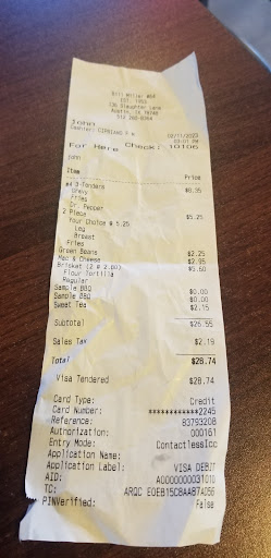 Read moreToday I went into Bill Miller BBQ with my service dog. I have a disability. My service dog was extremely well behaved (the people at the table beside us said they didn't even know she was there) but the area manager was there and he asked me to leave the restaurant because I had a service animal. She was dressed in a vest that clearly marked her as a service dog and although I politely explained the laws pertaining to service animals to him, he would not allow me and my dog to stay.