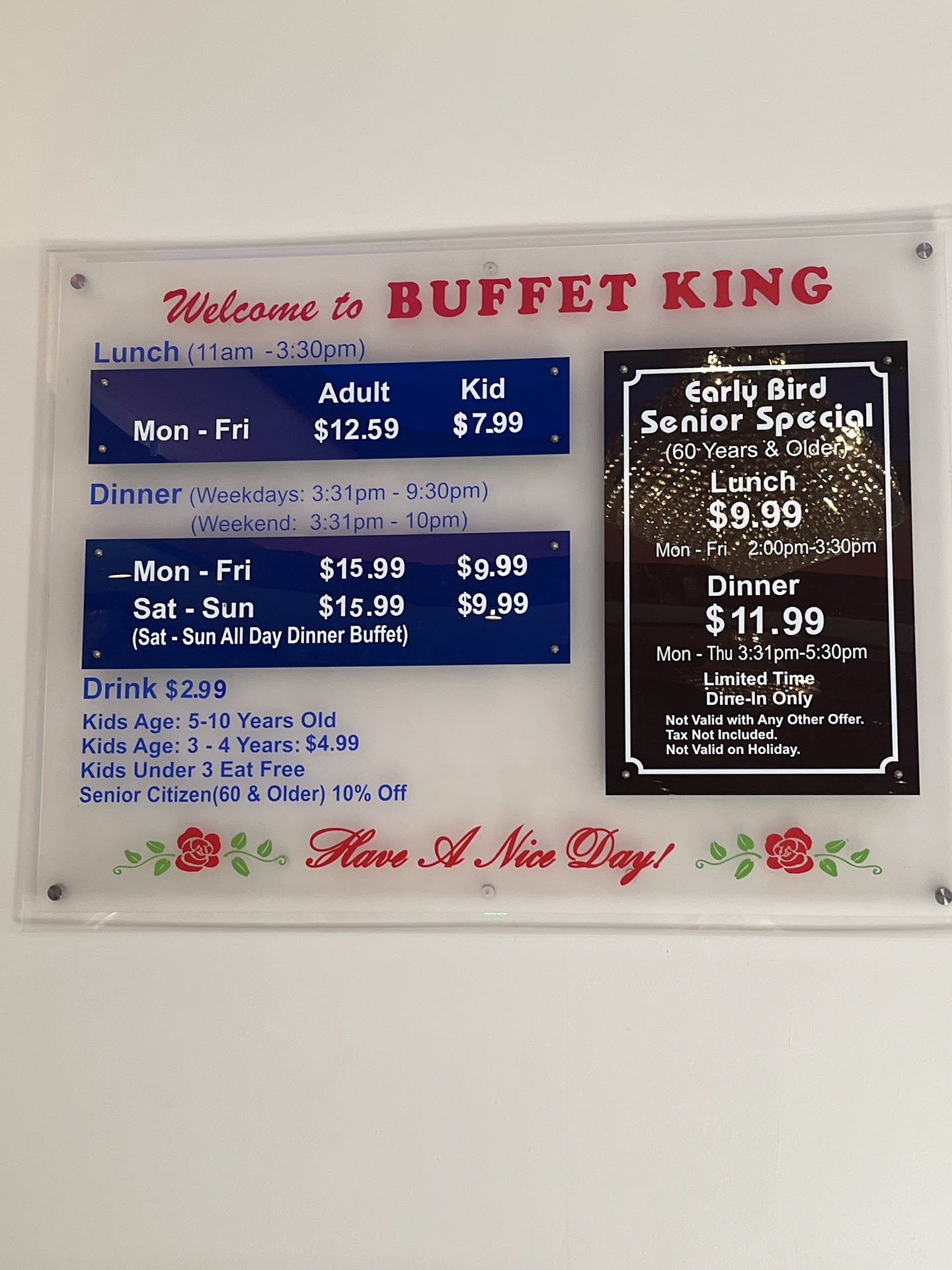 Read moreSaturday night around 8:30pm We decided to go to buffet king for dinner since it is the only option we have in the North East area. the time was 8:30pm when we set down for dinner. They normally close at 10pm on Saturdays, so i was thinking well there will be plenty of time to have dinner, minimum one hour for my whole family of 4 adults and a child. Our server was very sweet and attentive to us according to my 16 year old daughter. The only issue here is that there is not good food after 8pm, also not many food items available. For example I went to the sushi bar at 8:35 and the guy was almost Enty with not many rolls available for the guests, besides that he never made any sushi the rest of the night. My second choice was the Mongolian Grill and guests what! It was Enty with no beef, not chicken No noodles and most of their vegetables enty Yes at 8:45pm one Hour and 15min before closing. This one is almost my favorite part of the buffet kind and I don’t have any this time because of the condition of the options. My 3rd option was the hot food tables, my favorite is the general t’so Chicken and fried rice to be quick the chicken was too tough to chew and the Rice was dry and maybe prepared few hours ago. Those items are my daughter favorite food too and there were eating fruit instead because of the food quality. Me too, and the only item that I really enjoyed was the Hot and sour soup that was delicious and made to perfection, I also enjoyed the 6 piece of fried shrimp. No one leave full that night and normally we enjoy the food until we are satisfied especially because we are enjoying the buffet options but this time we asked the server to bring the check so we can go home early instead of being there just trying to find something good but most of the food containers were Enty and those with food hard and dry. This place have been my favorite because they normally have everything fresh and stocked with nice selections but not this time. We are clients of this place since they open here in Austin so I have the rewards card stamps so at the end of the night that was my only good Part Lol, getting 4 stamps for my $75 dollars bill. I also noticed that this place looks like is under a different management, there was a Young man that was at this place from the beginning of the opening and he was more attentive to the food item and he was checking in tables. and look Like he’s not there anymore because I was there with my daughter 2 weeks ago and he wasn’t there. Anyway I hope they can do better I know it was almost time to close but one hour and half before closing is still time to keep fresh food for the guests especially almost $20 per person.