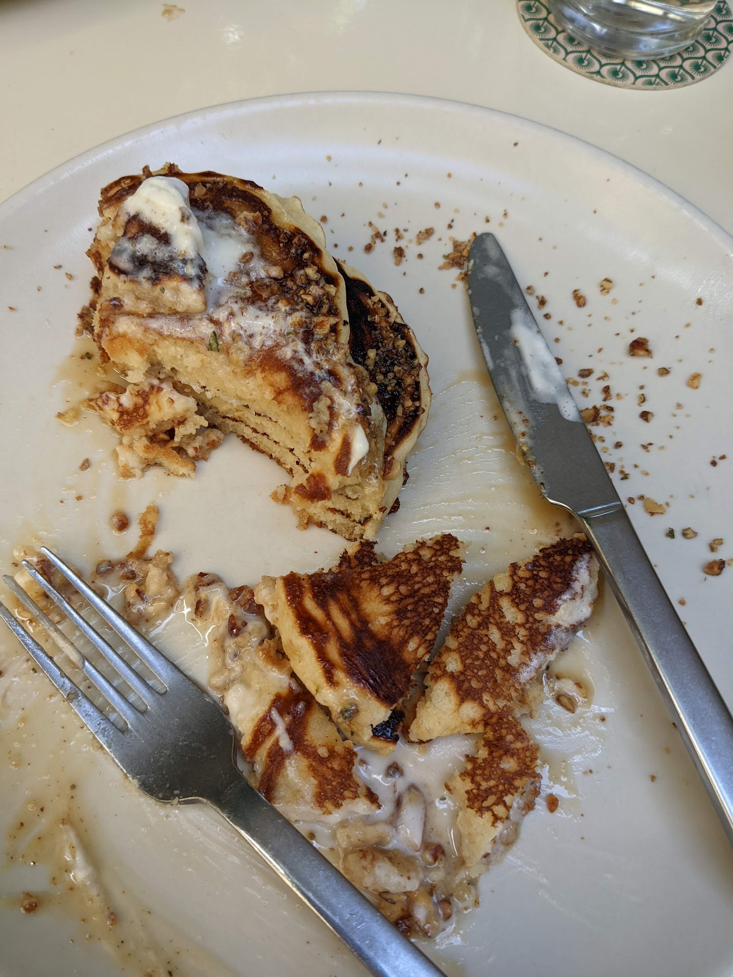 We had the crispy oyster mushrooms, very good. Cashew queso, that was okay. It's more like an extra creamy onion dip with a queso consistency. So calling it queso is a little misleading, but it was still decent. I ordered the pancakes. They were delicious. Just be aware that no syrup is served with the pancakes or maybe my waiter forgot it, however, I didn't mind since I don't care for syrup that much and they were still delicious without it. My friend had the egg sammie and she said it was decent but difficult to eat in the sandwich form. The chili hatch home fries didn't have any "hatch" to them, but they were decent. They were just essentially home fries not hatch chili home fries. Again, I'm not sure if something was left off or if that's how they are actually prepared. Overall, I really wanted to enjoy this meal, but service really...