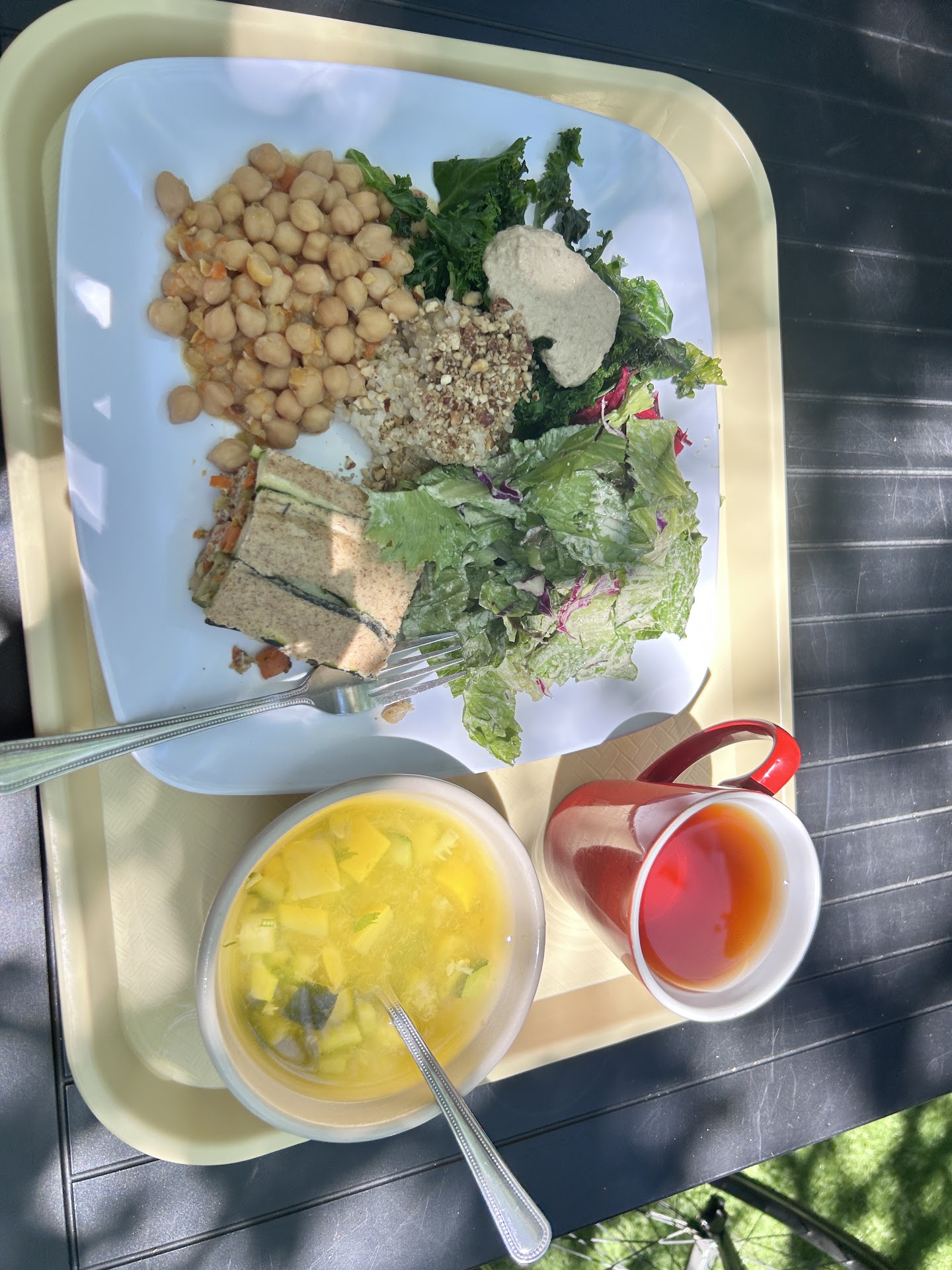 The food is great—that’s why I come here! I know I’ll always leave feeling amazing and wonderful after every meal. I feel full without feeling sleepy or weighed down. The meals generally follow the same structure: kale with a nut dressing, tossed salad with dressing, rice or grains in the middle, beans or another form of protein, a rotating main dish, and a soup. There’s only one thing I dislike in their rotating menu—the tacos. I’m not a fan of the asparagus sticks in them.