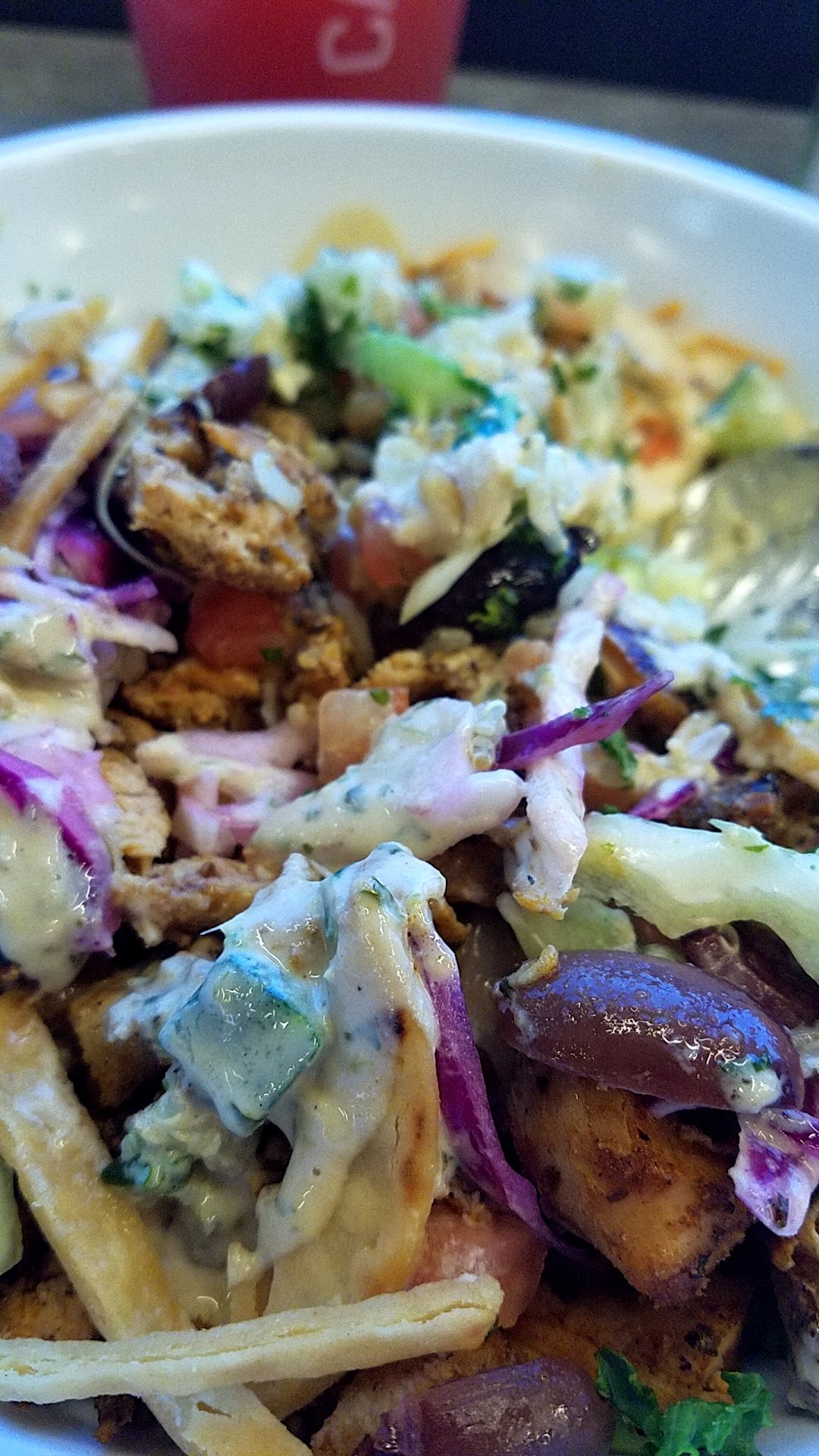 I got a customized Greek chicken bowl with yellow rice, Romaine, Arugula, spinach, tzatziki, harissa, tomatoes, cucumbers, pickled red onions, Kalamata olives, feta cheese, and light Greek dressing and it was the best thing I've had here ever. The portions were generous and the staff was engaging and friendly.