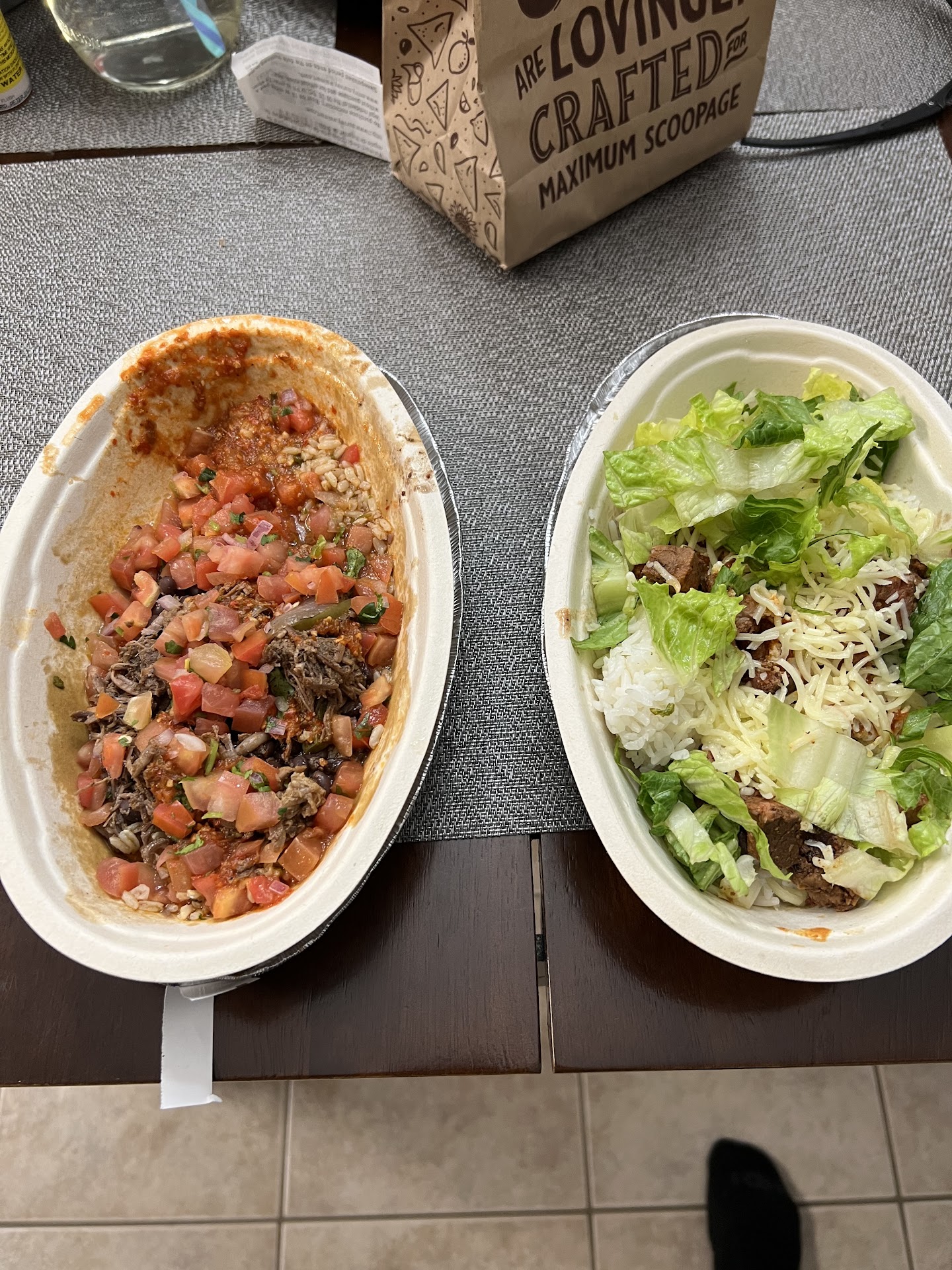 Read moreI ordered from the Chipotle app so I could pick up at the drive thru. When I received my order, I could immediately tell that the bag felt very light compared to usual. Pulled into a parking spot and opened the bag to find that my burrito bowl was only about half full. I went inside and waited in line to request to have my order fixed. The employee informed me that there was nothing she could do so I asked if she could have the manager come over and look at it. The manager was at the drive through window which was about 8 steps away from the counter and she refused to come fix the problem. They gave me a tiny little cup of chicken and cheese because part of my complaint was that I had ordered extra cheese and extra chicken and still had a half full burrito bowl.