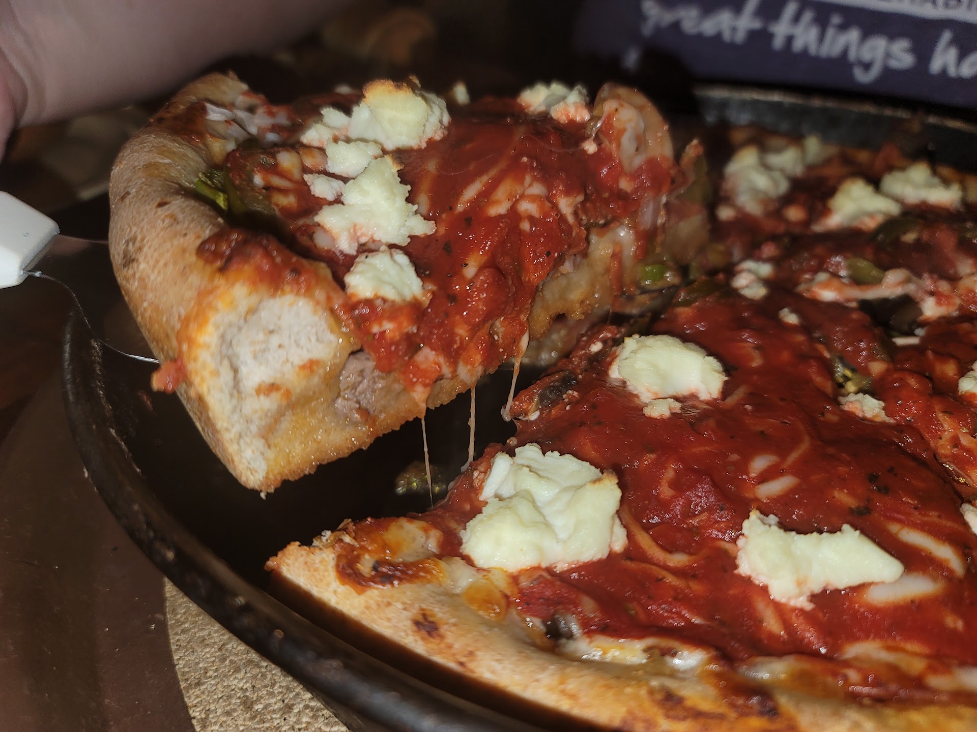 Read moreI've dined in twice at this location and picked up once. the first time, I was extremely hungry and we had a pretty long wait, but when I got the pizza, it was so hot, and we were in a hurry since we didn't know of the long wait it was gonna be, so I had to rush, and didn't get to really taste the pizza because it was so hot. loved the look of the place though. second visit was carry out. I ordered the thin crust, plain pepperoni. it was delicious, and not too hot. the crust was a little hard for my liking, but that's just a personal preference. still great. the third visit, in a hurry again to eat quickly and get to work. honestly did not remember it taking that long to make a deep dish plain pepperoni once again, but of course, it did take about 20 or so minutes. then when they brought it, they apologized because it was well done. burnt in other words. the still cheesey cheese on the bottom layer, not the black top, was awesome. BUT once again, I was in a hurry and had to eat very quickly. I had sores on my pallet for days. the burning my mouth part on both visits are really just my fault for being impatient, but just be warned. delicious either way. I'm really drawn to anything that was produced in the 80's be it film, buildings, cars, anything really. and this place just seems like it should've been in some 80's movie. it sucks there's never anyone there, so its not that fun to go by yourself. oh, and they have a GREAT staff, very helpful...