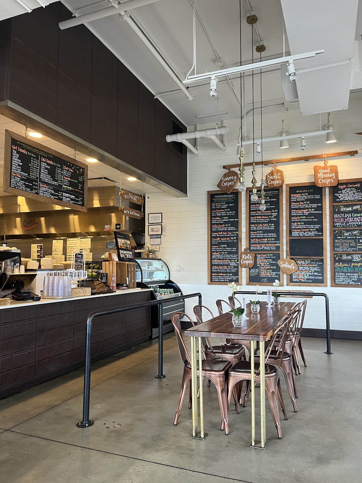Read moreThis feels too hipster for me. Only one self check out kiosk with too many options to slide through to order quickly or find what you want. Not everything on there matches what's on the boards. We ordered an Americano that came out as an expresso. I couldn't find fresh orange juice in the kiosk which was on the board so got a fountain drink which they bring out to your table several minutes later rather than just have them by the register like every other restaurant with self check out. The food came in waves. I got the cowboy which was a crepe with bacon ham egg and cheese which was kind of plain and difficult to cut with the plastic cutlery ( it's half real plates and cups, half disposable plates, cups and cutlery for some reason.) So we both started eating our crepes like burritos because it was easier. My wife git the granny apple one, and she thought the apples needed to be cooked some, and it needed a sauce or something to go with it as well. Not the best crepes ever. The savory crepes seemed a little overcooked while the lemon desert crepe was better but a little on the chewy side. I feel like I've had much better crepes before. Overall, the ordering experience was a little frustrating, and the food was forgettable. I feel like there are better crepe places you can go if you are actually crazy...