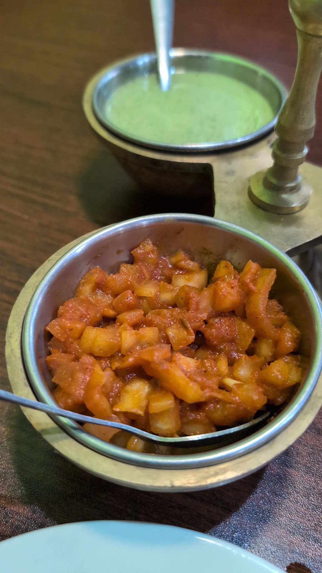 We dined here on a Monday, something we don’t usually do as restaurants tend to have bad service but we were hungry and read reviews so thought we’d give it a try. Service was great, from the host to the server and even the chef greeted us. Which reminds me, food in here is cooked by a chef! It’s been long and not even in Texas that we encountered an Indian/Nepal restaurant that used good serveware. Food was much more enjoyable just because we had decent plates and flatware. There is just so much attention to detail. We also had a complimentary appetizer that we enjoyed a lot. A crispy wafer with some Indian/Nepal chutneys. My favorite was the onion one but I kept on adding mint to everything.