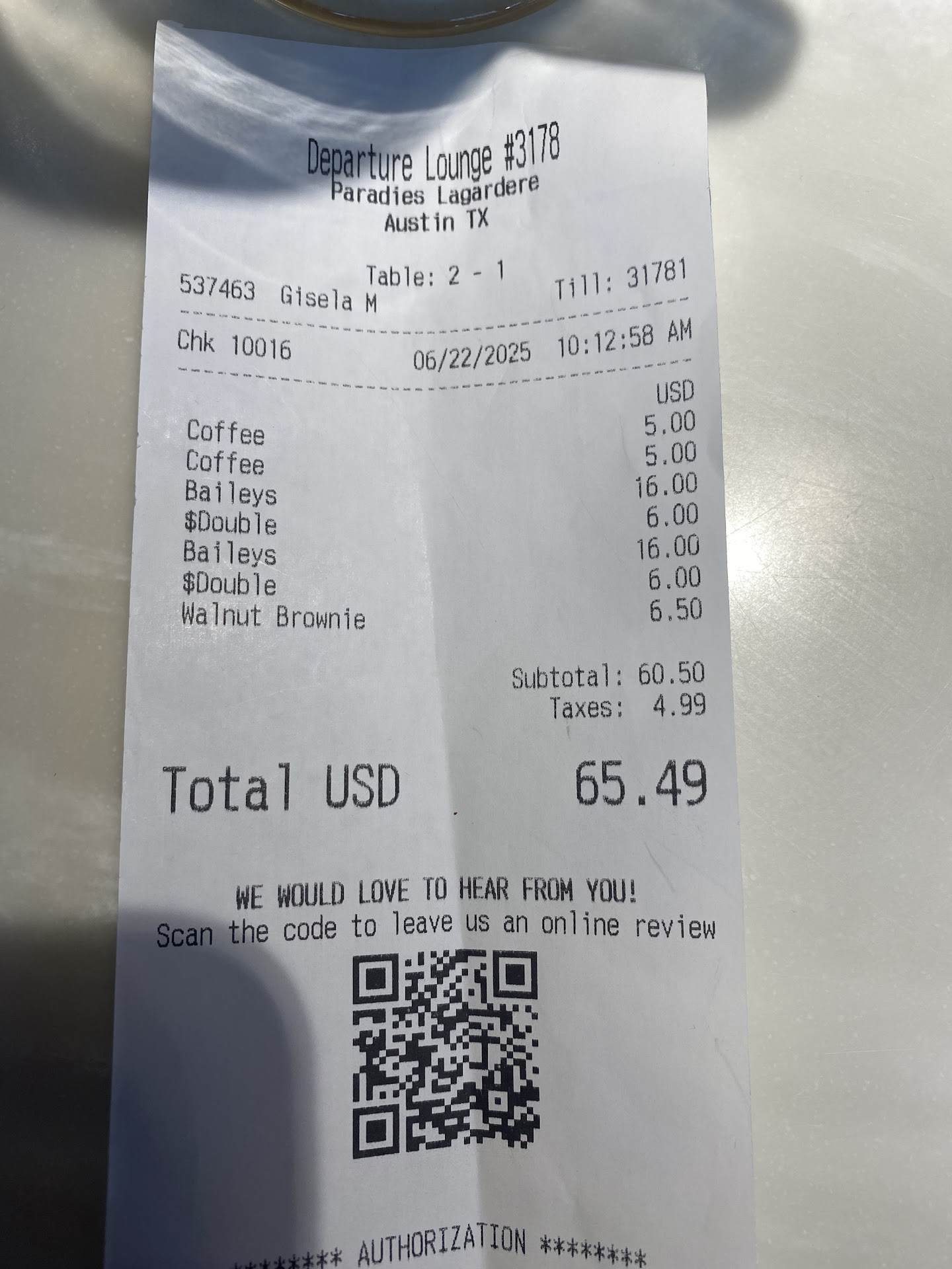 Read moreDear Team, I am writing to you to inform you about the fabulous experience I had in your establishment at the Austin airport. I had exceptional service from both Anthony and Dailyn. The were friendly and helpful and a font of wonderful joyful conversation. I have never had such a pleasurable experience at an airport before. I was delayed 3 times on flights today and your team here really made it fun for me. Southwest and the other airlines should be paying you guys for the unbelievable support your team provide to travelers by making them welcome and happy. Thank you for the fantastic experience, 100 out of 10 I will come again and look for reasons to travel...