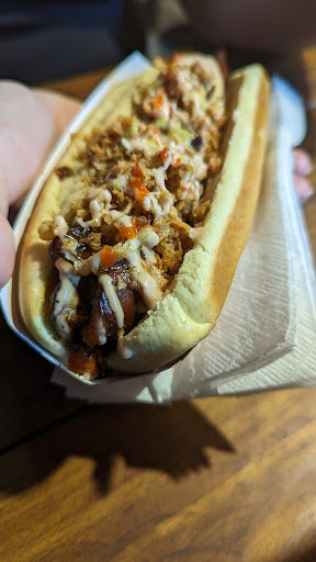 We loved the food!!! This was the first food truck we saw in the food truck zone and we came back to it after we looked at all of them. This seemed like the most unique option. It was tasty!! I liked my bulgogi fries!! The bulgogi had an unexpected taste but it was good! I've only had bulgogi maybe 5-6 times in my life and mostly at Korean BBQ places in Seattle, with one at an H mart, so I don't know how it "should" taste. I loved how clean the truck and tables were. I could see in the light bouncing off the touch screen that the touchpad had been cleaned because my fingerprints were the only ones showing up. I liked how well lit it was. We were scared to be in the area, but this place made me feel so much safer. Our hotdog is sans chipotle mustard.