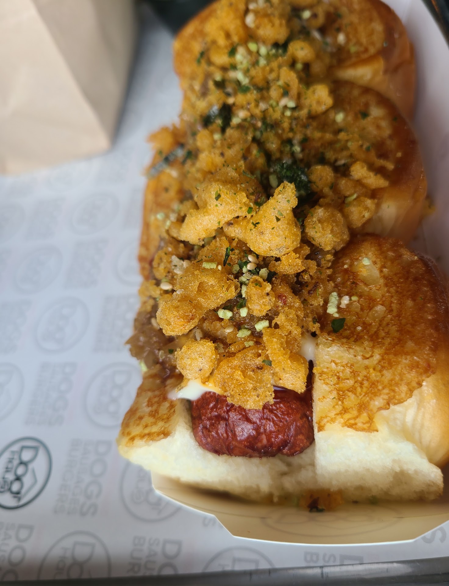 The two 2nd pics are the Pineapple Express which is a bacon wrapped frank, bouillonaise, sweet ginger glaze, pickled jalapeƱos, scallions, and crispy onions on Kings Hawaiian bread.