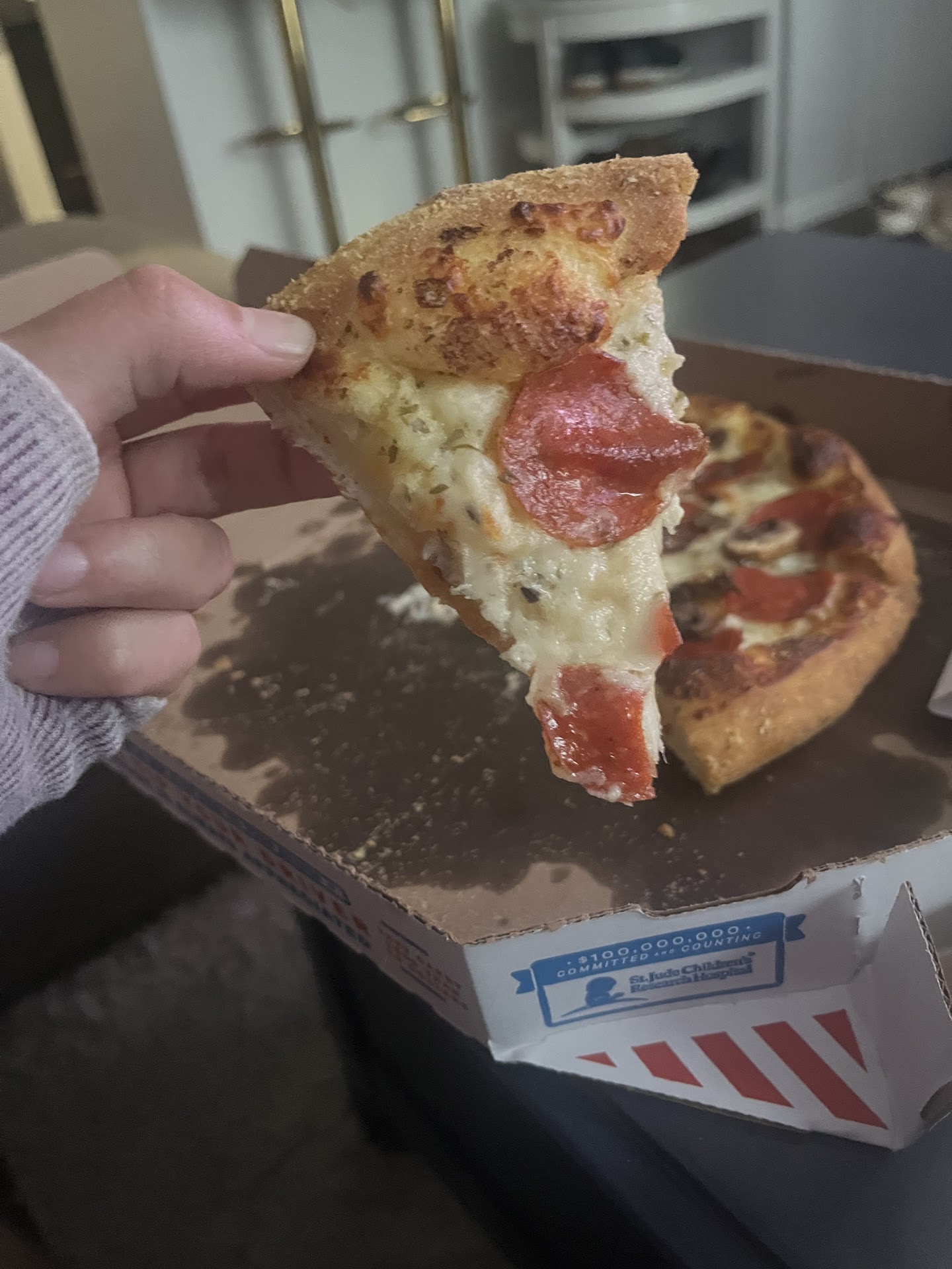 Because the next morning, EVERYONE who ate the pizzas - all ate different pizzas - were sick. I think they made the pizza at 5 when I ordered and then just placed it in a warmer until 8:15. Not okay. That is how you get food poisoning, which is unfortunately what happened to us.