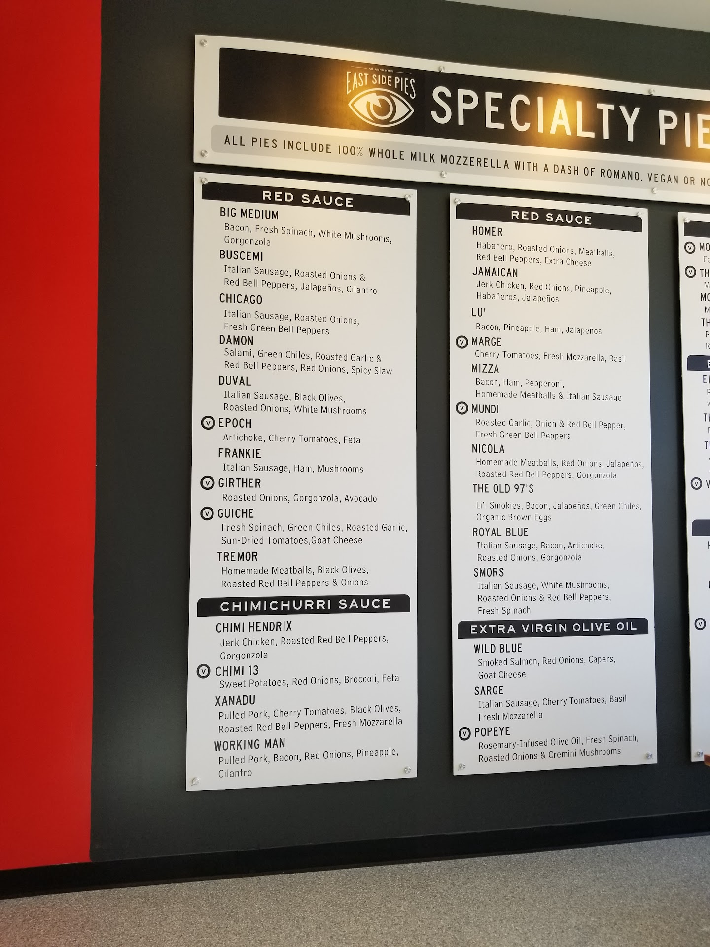 If you want a decent thin crust and you like combos such as pineapple and bacon, or other more unique, non-standard combos, then East Side pies is for you. If you are a true lover of NY style, premium pizza pies where it's about the dough, the cheese, and the pepperoni, go to Home Slice. (Also much better...