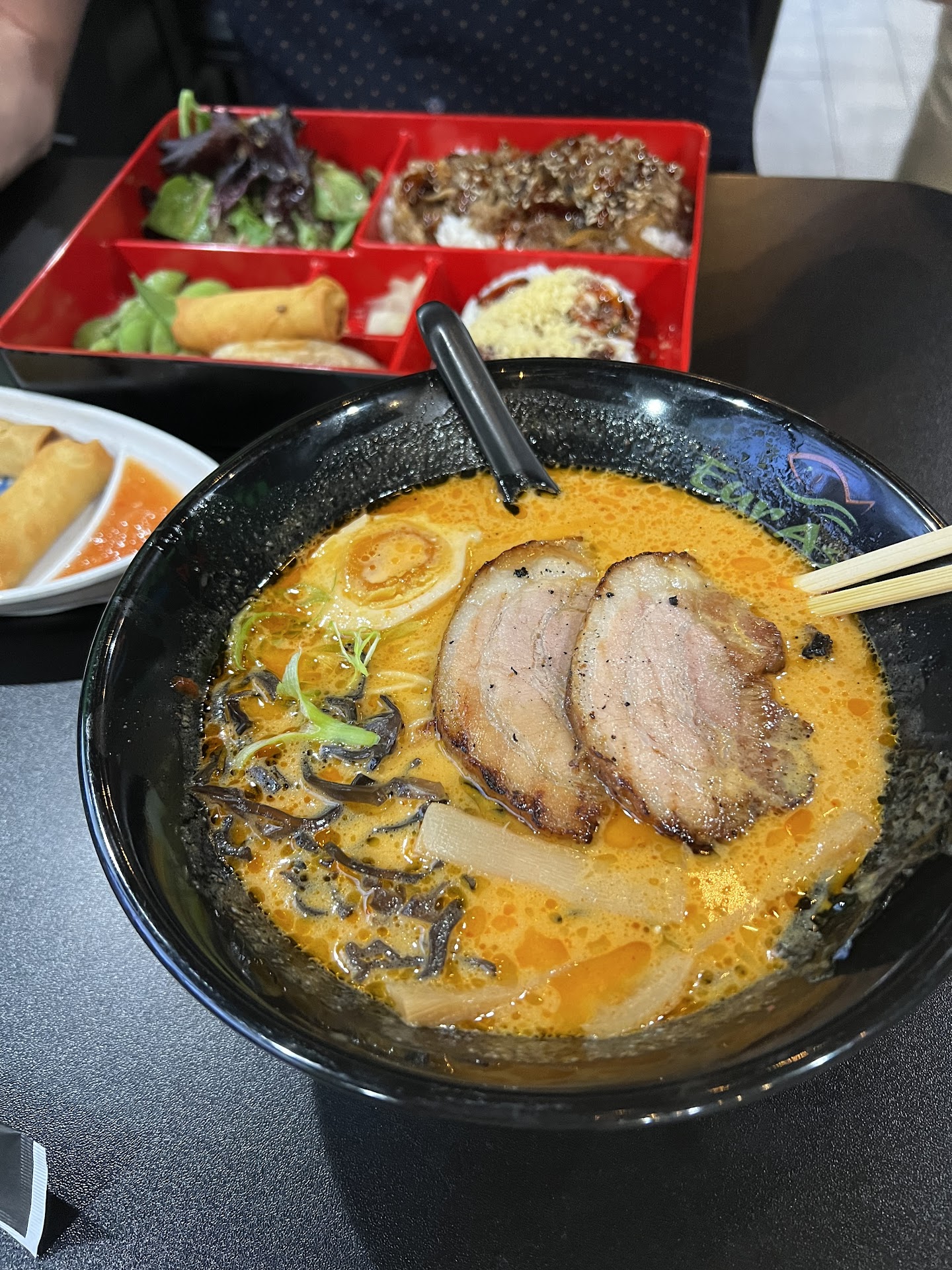 Read moreBeen here in person several times and always loved it. So I ordered take out for my partner’s birthday and was quite disappointed. He ordered the beef bento with extra chicken and beef for and extra $10, which was NOT added. We ordered an appetizer of spring rolls and they were soggy. I don’t know if anything else was wrong with my partner’s bento meal, but he was clearly bummed. And lastly, my ramen broth tasted flat. I literally had to add salt and spices to mine to flavor it. I have two pics comparing them. The flash kinda makes it hard to tell, but hopefully you can still see. One is from in person where it tasted great. The other is from my takeout order and you can see it is lacking that rich red oil. It really dampened the mood for my partner’s birthday, which is very upsetting. We have friends coming into town next week and we were going to take them here, but after this experience we’re going to hold off...