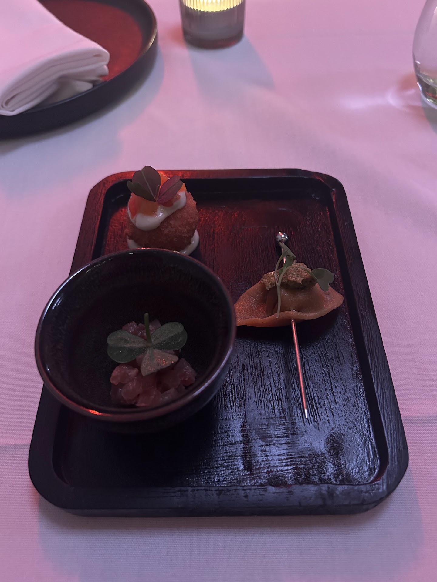 The restaurant only sits 16 people at time in dinner service. There are two separate seating areas, one upstairs and one downstairs near the kitchen. If you want a more private, moody setting, I would suggest asking to be sat in the upstairs area. If you do not mind a slightly louder ambiance and seeing the kitchen prepare the dishes, than the downstairs area would be best. I lucked out on getting reservations via Open Table two days prior to our dinner – the restaurant staff mentioned that they are booked fully until February 2025 but that if you keep checking the table about 2 days before your desired date tables reservations sometime open up. I would not recommend a reservation greater than 4 people – we had 4 people for our reservation and it took up the table. Almost all their tables are for groups of 2-4 people.