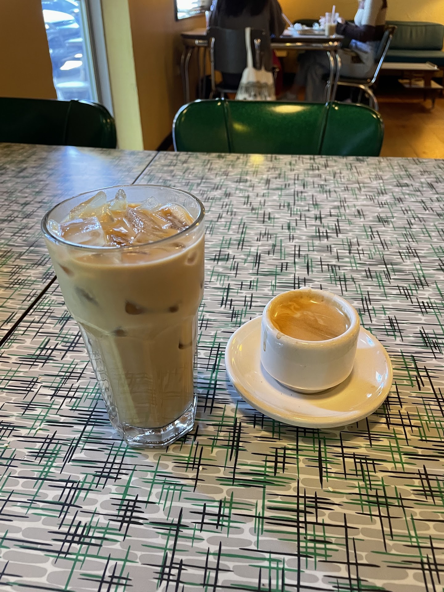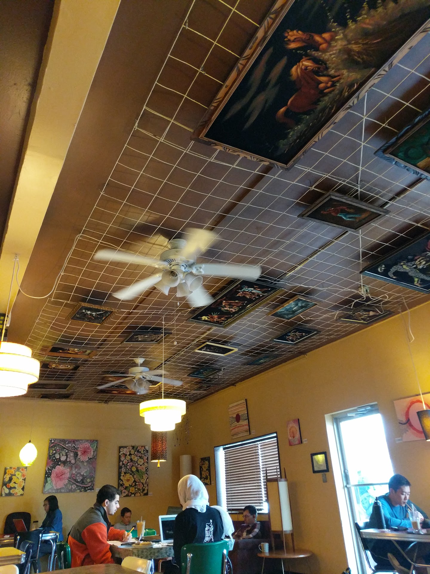 I love coming here to work on my grad school assignments, the art and environment is really thoughtful, cozy, and unique, which I like a lot more than the more "industrial/sterile" contemporary vibe of other coffee shops. The iced coffee is very solid and reasonably priced! The outside area is nice, but the last several times I have come, there have been people smoking cigarettes in the outdoor seating area, which really affected my breathing and concentration. While they do have a sign that says "no smoking within 15 ft. of doorway", the outdoor area is pretty tight and enclosed with tall fences and roof, allowing for minimal airflow. I wanted to stay working on an assignment outside for a good chunk of time, and I even put on a mask to protect myself from the smoke. Ultimately, I had to leave today earlier than I had wanted because the smoke in the outdoor environment was just too uncomfortable. It would be nice to be able to chill in the awesome outdoor area without having to worry about being bothered by...