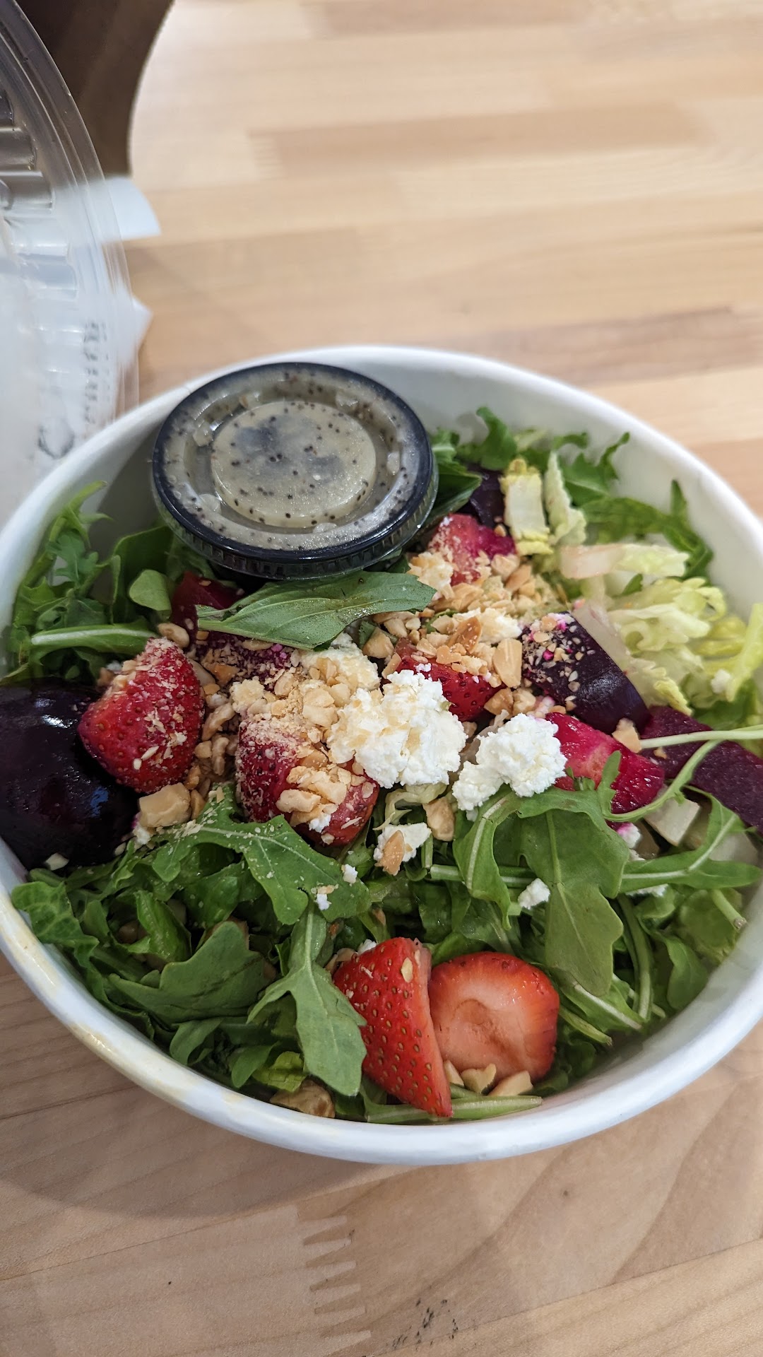 Read moreI paid $15 for a strawberry and beet salad and a chocolate cashew cookie and I started getting hungry only a couple of hours later. The service was great, it was just the menu I have issues with. I don't like spicy food or avocado. The menu was pretty limited for me because of that. Chicken is almost $5 on top of the base salad and Shrimp $6.75 on top of the salad. I decided I'd be fine with just the salad and a cookie, which was only $3 and unique-sounding since it's chocolate cashew instead of the normal chocolate chip. The poppyseed dressing was not enough for how much arugula and salad leaves they give you. I should have asked for an extra dressing, but I'm kind of worried that would be an extra $2 based on the price of everything else. I find it hard to find beets on things and I like them, so that was nice. Also, the cookie was pretty good!