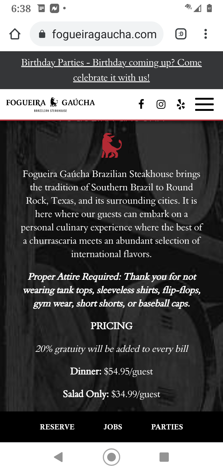 Recently, when planning our teen son’s birthday dinner, he said he wanted to go to Fogueira Gaúcha. I went online and made a reservation, and because we had not dined in the restaurant in a while, I perused their website to make sure nothing had changed with their dress policy. Their website states “Proper Attire Required: thank you for not wearing tank tops, sleeveless shirts, flip flops, gym wear, short shorts, or baseball caps.” This policy is easy for us to follow.