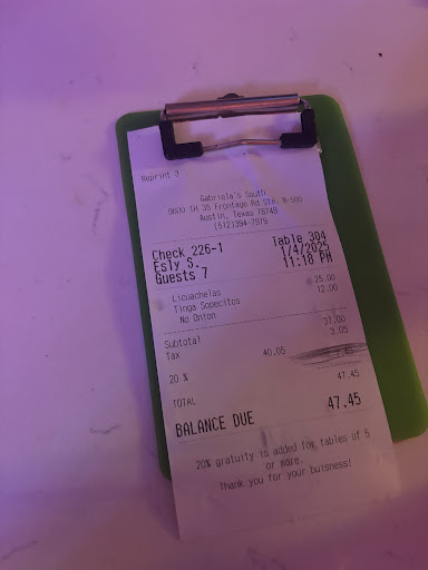 Read moreFirst let me say that Gabriella‘s is one of my favorite places in South Austin. With that being said I am saddened to give this restaurant a two star review. After dinner tonight I was so upset and disappointed that I can’t say 100% that I will be back to this establishment. When we arrived everything seem to be going well they placed at a nice table outside the music was a little loud but not too bad when we couldn’t hold a conversation. While waiting for the waiter to come place our drinks order we waited about 15 minutes before anyone came now it is a Sunday night it wasn’t too crazy busy but there were a few tables with people sitting at them. We did place our drink order and I ordered the queso con chorizo for the table it came out in a reasonable amount of time but there were no plates or silverware for us to use to eat this. After waiting about 10 minutes for our waiter to come back so that I could get utensils and plates for the table no one came and finally I got up and got them on my own at a nearby hostess stand. While waiting for the waiter to come back to place our order about 20 minutes later after flagging him down he came back to take our order we waited about 30 minutes for food and when it came out it came out cold which is very disappointing because the Shrimp tacos are my favorite. We waited for our bill and again I had to flag down the waiter he didn’t even ask if we wanted to go boxes when receiving our bill we noticed a 20% gratuity tacked on for our tables of five or more which I feel is unfair for poor service. If our waiter actually did a great job I wouldn’t mind the gratuity by any means but the fact that I had to get my own silverware my own plates I had cold food and I had to keep flagging my waiter down not to mention I ordered salsa for the table and it never came all of these things that’s what’s bringing me to such a bad review for...