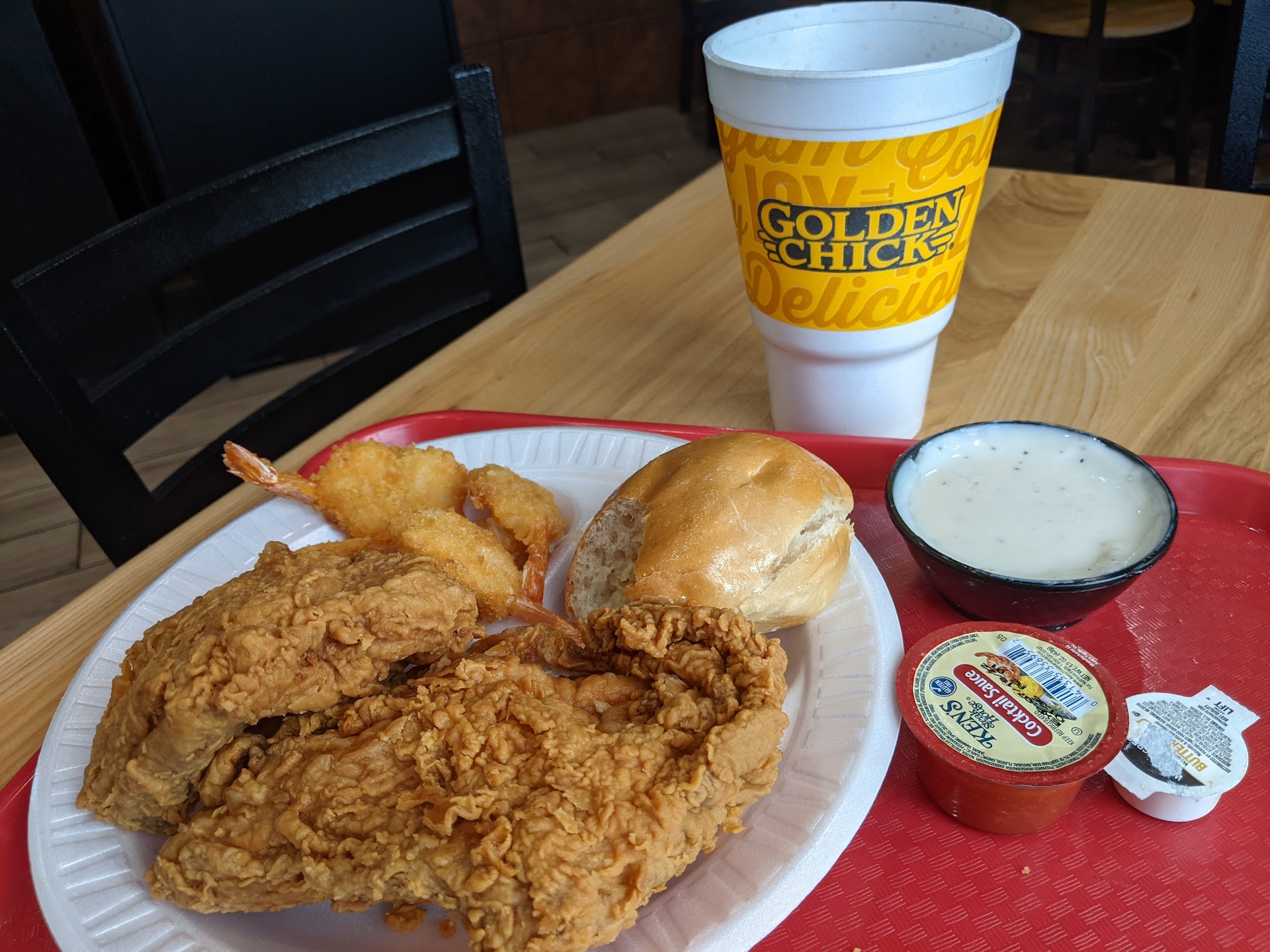 Read moreI've been patiently waiting for Golden Chick to reopen their dining room and today it paid off when I sat down at a table, in air conditioned comfort and had fantastic fried chicken! I like eating fried chicken while it's still very hot but crunchy chicken batter and the dark interior of my car do not happily co-exist so dining inside made the chicken taste even better! The mashed potatoes and gravy are OK but chicken will always be the star of the show at the eponymous named chicken chain that got it's start 50 years ago in San Marcos. The yeast roll was also great as usual and the only thing missing was the self serve, "soft serve" ice cream, a temporary casuality of Covid according to the cashier. I like all the sides at GC and you can get two sides instead of one at no additional charge if you forego the beverage that comes with most combo meals. If you like fresh, crispy fried chicken that's always served hot you'll enjoy Golden Chick. Bon appétit!...