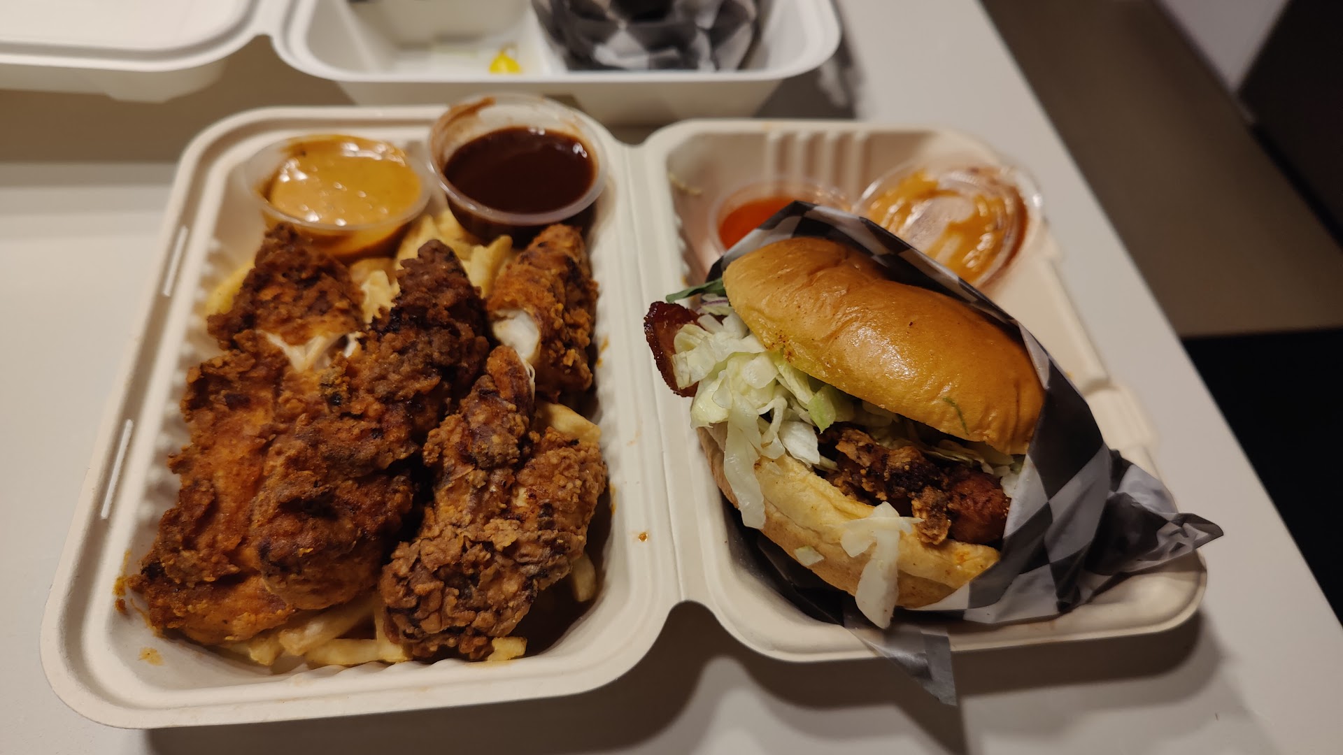 Edit: the reason for three stars. When I try a new restaurant myself and my husband always order a sampling of key menu items so we ordered chicken tenders, a burger and fries. The burger was amazing definitely joints should take note force to be reckoned with good. The chicken was so-so the crispness was there but it lacked depth of flavor in the actual meat ;the batter was steller however the more lean sections where dry. The fries where a bit hard im good with double fried however texture wise they seemed a little over fried and not as tender as I was expecting on the interior. My rating was based off of these three items one was great but the other two felt lacking (your honey mustard I literally could have drank that alone) I judged it based on all of the things I tried. I hope this provided some insight on my experience.