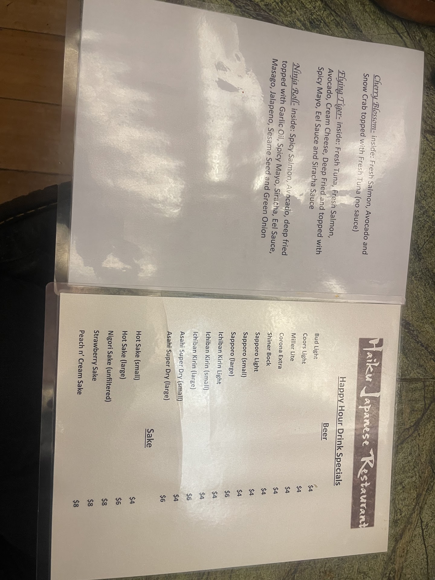 My last visit 2-3 yrs ago: "I'd never return," but a family member suggested Haiku, and the birthday boy agreed. Time changes things: employees, mgmt, etc.: Much improved from my last experience! Sushi Happy Hour is definitely the time to go to take advantage of $ savings! Sushi was fresh, nicely sized pieces of fish. Still find it fairly costly, as it's per 1 piece (vs 2). Basic rolls are small, but good. Larger, fancier rolls (not part of Happy Hour) are good: it's all about your preferences of contents (my sister was bananas about the Dynamite roll, but it was only "ok" to me). Harimaki: awesome. Unagi bento box: eh/average. Crispy fish: tasty and nice presentation, but not exactly worth the cost. Hot sake: average. Miso soup: par. WASABI: POOR - grocery store tube sadly is better. Their new "fresh root" wasabi (special order, extra cost) is personally what I would expect to be a restaurant norm (be sure to order it if you care about good wasabi). Our server: attentive, pleasant. Weird quirk: party of 6, and he kept bringing 5 of everything (chopsticks/utensils, plates, waters, etc). Big bonus: when he learned it was a birthday, he presented a complimentary tempura banana dessert (lol, with 5 forks!).