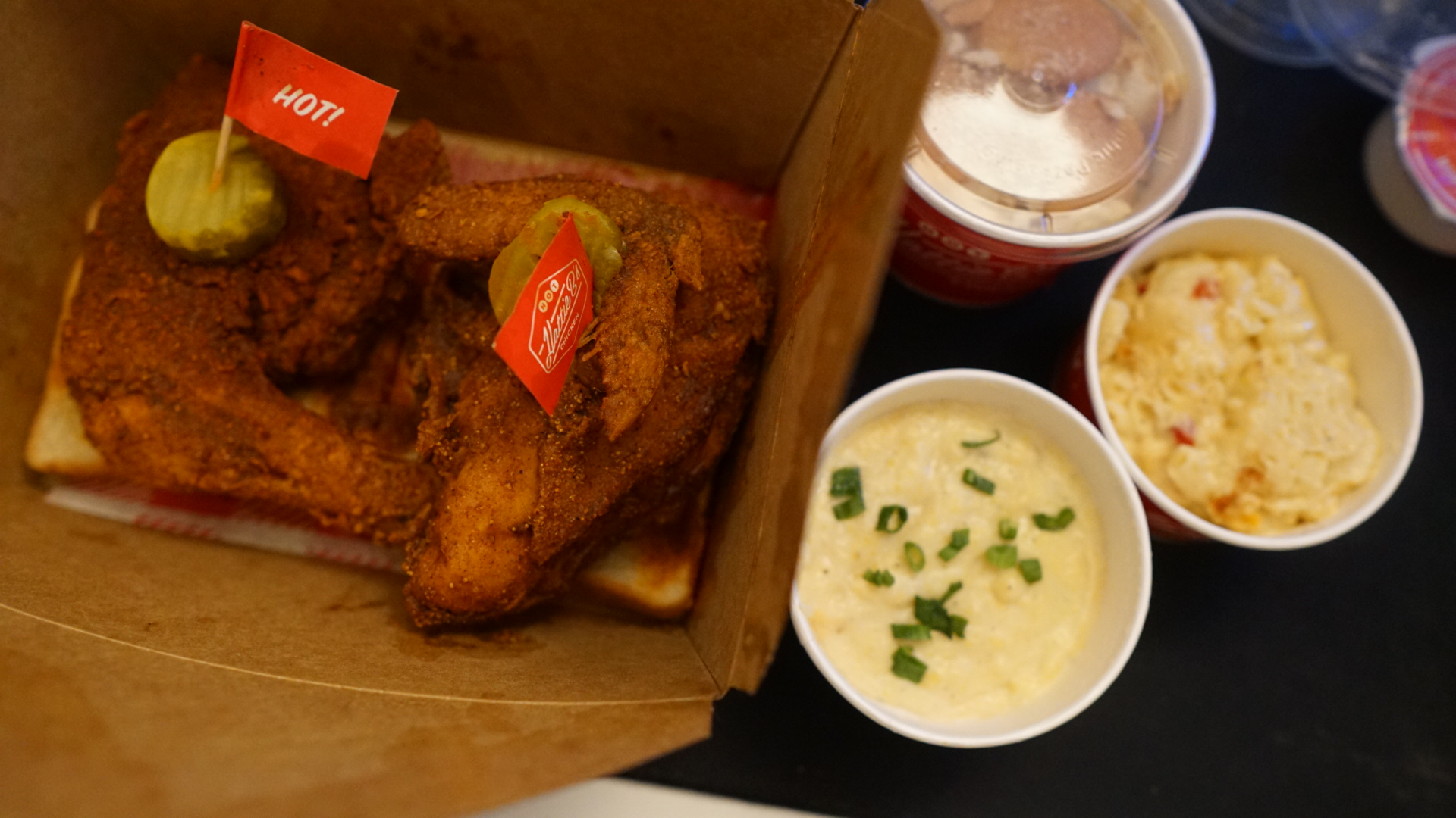 My order: Half Bird (half medium - leg/thigh, half hot - breast/wing) Pimento Mac n Cheese Bacon Cheddar Grits