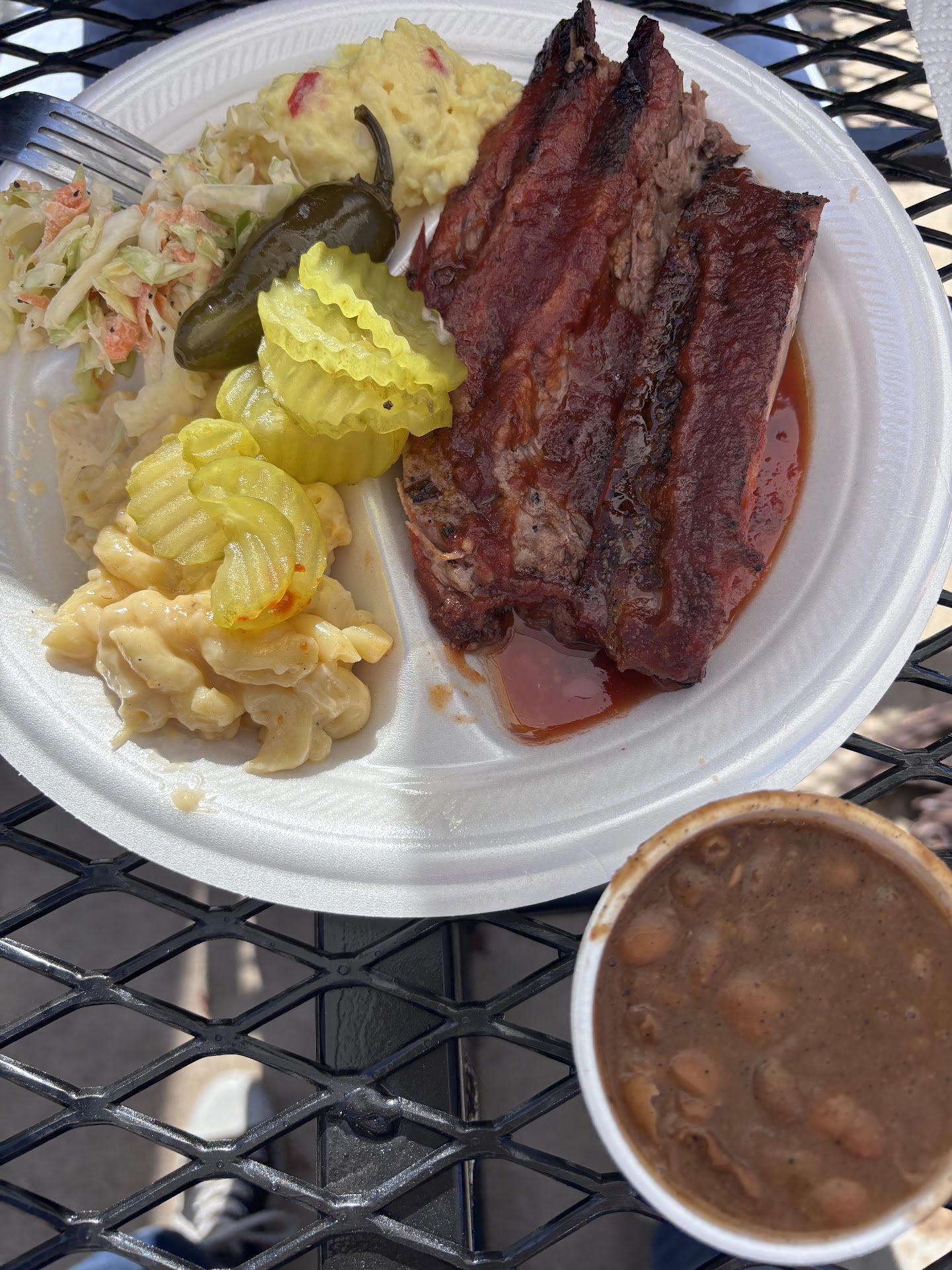 I ordered a two-meat plate with moist brisket and pork ribs with a half link of sausage. The plate also came with bean, potato salad, and coleslaw. The brisket had two stories. So the long piece on the bottom of a typical brisket is the flat (lean). The top piece that covers half of it is the point (moist). The flat was chewy, and the point was super fatty. They must have cooked it too high and fast. It had a smoke ring, but without, I would have guessed the brisket was done in an oven. There were no flavors, and it was bland. The ribs were slightly better. They were dry, but the rub had a nice spice. You had to work a little to get the meat off of the bone. The sausage is made by the Texas Sausage Company which is the same people who make the sausage for Franklin Barbecue. It is sad if that was the best thing I ate. The sausage was a beef and pork house blend. The peppercorn gave it good kick. The sides were boring but did look homemade. More seasoning please?