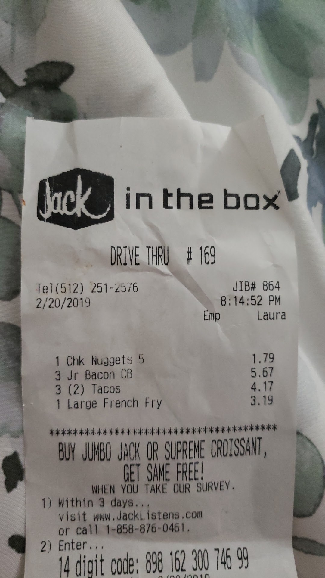 This is place is super sketchy. Scam alert here. I drove up to pay for my order and there were two girls at the window. One was facing the drink machine and the other the cash register. I handed the girl in register side 83 cents and I dug in my wallet for a $20 bill. After I gave her the 20, the other girl hands me the note I have pictured, I take a moment to read it and felt soooo weird about it because I am at Jack in the Box. HOW ARE YOU GONNA TELL ME BE HEALTHY???? Right after that, I look back at the window and question why the girl at the register isn’t working on getting my change, she then lifts up a $10 bill and asks me “This is a really old $10 bill right?” I look at her puzzled and agreed, she then hands me a $1 which means she’s shorting me $10 in change. I tell her that I handed her a $20 and she said “No, you handed me a $10 bill I even asked you about it remember? I mentioned about it being old?” I said “Yeah but that was after I handed you the $20 and your friend here handed me the note.” She stuck to it and so I just said “ okay that’s fine, y’all have cameras here right!?” She said “yes, we do” I said okay I will come by tomorrow during lobby hours and speak with a manager about possibly looking at camera footage to make sure” I went back the same night and spoke to the manager, she took a picture of receipt for time stamp on video and she said she was going to let me know but she didn’t get my number because I was in a rush to get out of drive-thru line because I felt terrible for the people waiting in line. I tried to call them today and their phone line isn’t working. I guess I will just have to “stay healthy and strong” and stop going to Jack in the box. I’m almost positive the whole note thing and the question about the supposed $10 bill was to confuse me and I’m sure it’s not the first or last time they stole from people. Coincidentally, when I went back to speak with manager I heard that they had just turned in register and they were not over. I feel like they knew it was almost time to switch registers and decided I was a good candidate...