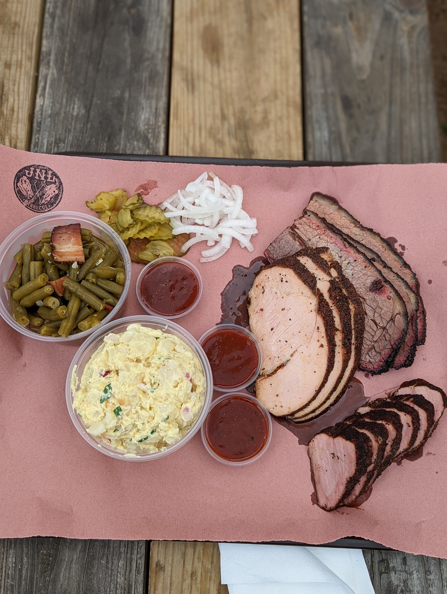 I'll start by saying the brisket and ribs here are top notch- easily competitive with the best Austin has to offer. I've had every meat they offer with the exception of the bacon. The turkey and pulled pork are good, but nothing spectacular. I've had better pulled pork from quite a few other places, but I usually don't get turkey so it's hard to compare that. The sausage is very good as well, but the casing on it is too tough and can even be a bit hard to chew through.