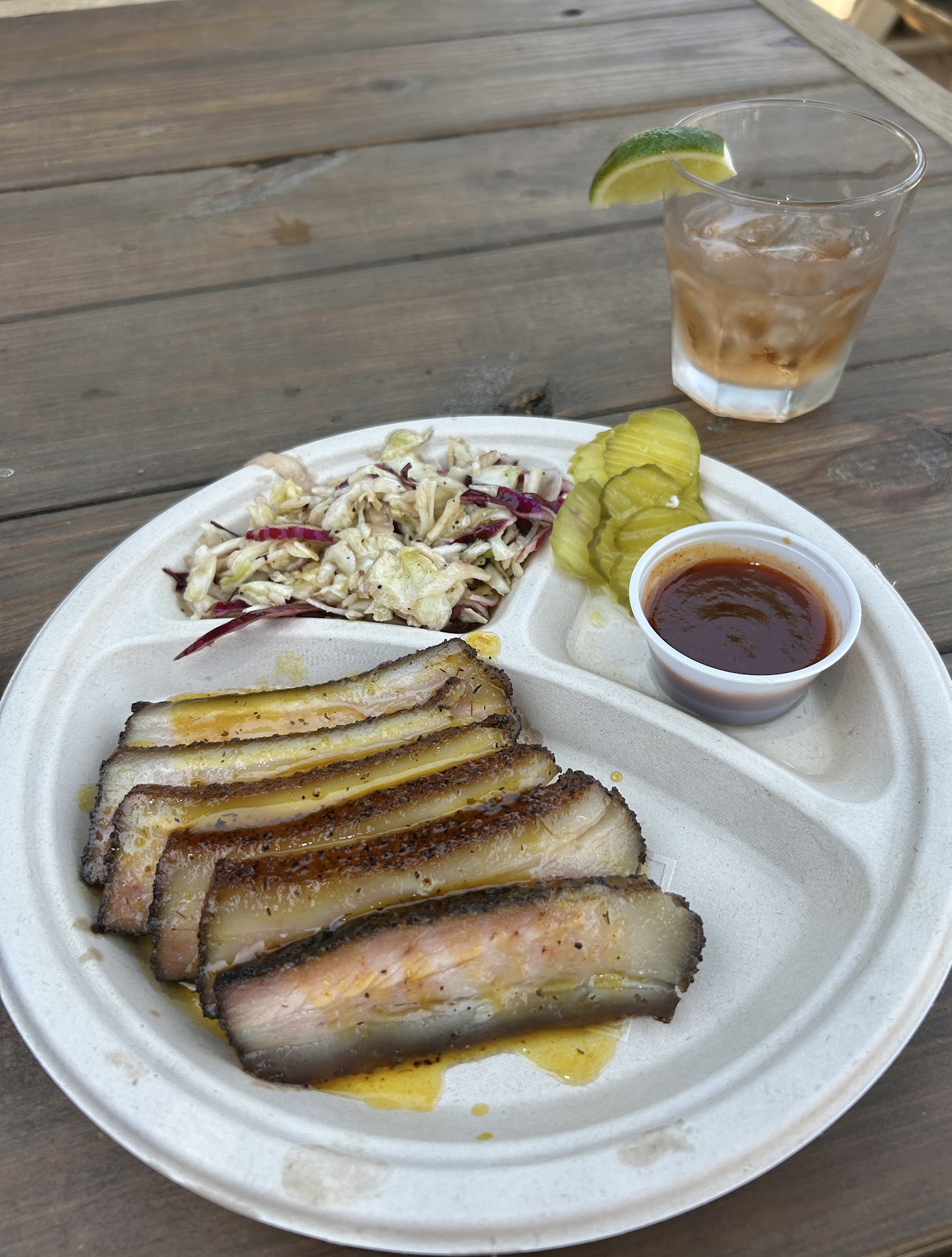 Read moreRun don’t walk to JNL Barbecue at Buzz Mill off E. Riverside. Today, I decided to treat myself with an adult beverage and lunch. Once I read about JNL, I just had to try it and they did not disappoint. I got the Peach Glazed Pork Belly with a single order of Cole Slaw. The slaw was vinegar based and so tasty I ate it quicker than I anticipated. The pork belly did not let me down either. I am a sucker for a piece of fatty meat and I can’t say enough good things about this dish. The peach taste was perfect. It was just the right sweetness and vinegar blend to make it a perfect combination with the pork. I asked for the barbecue sauce to try and the peach and pork also worked well with the sauce. I could actually just eat the sauce with a spoon though if I wanted to. All that food was under $20! This plate paired great with the strawberry jalapeño tequila...