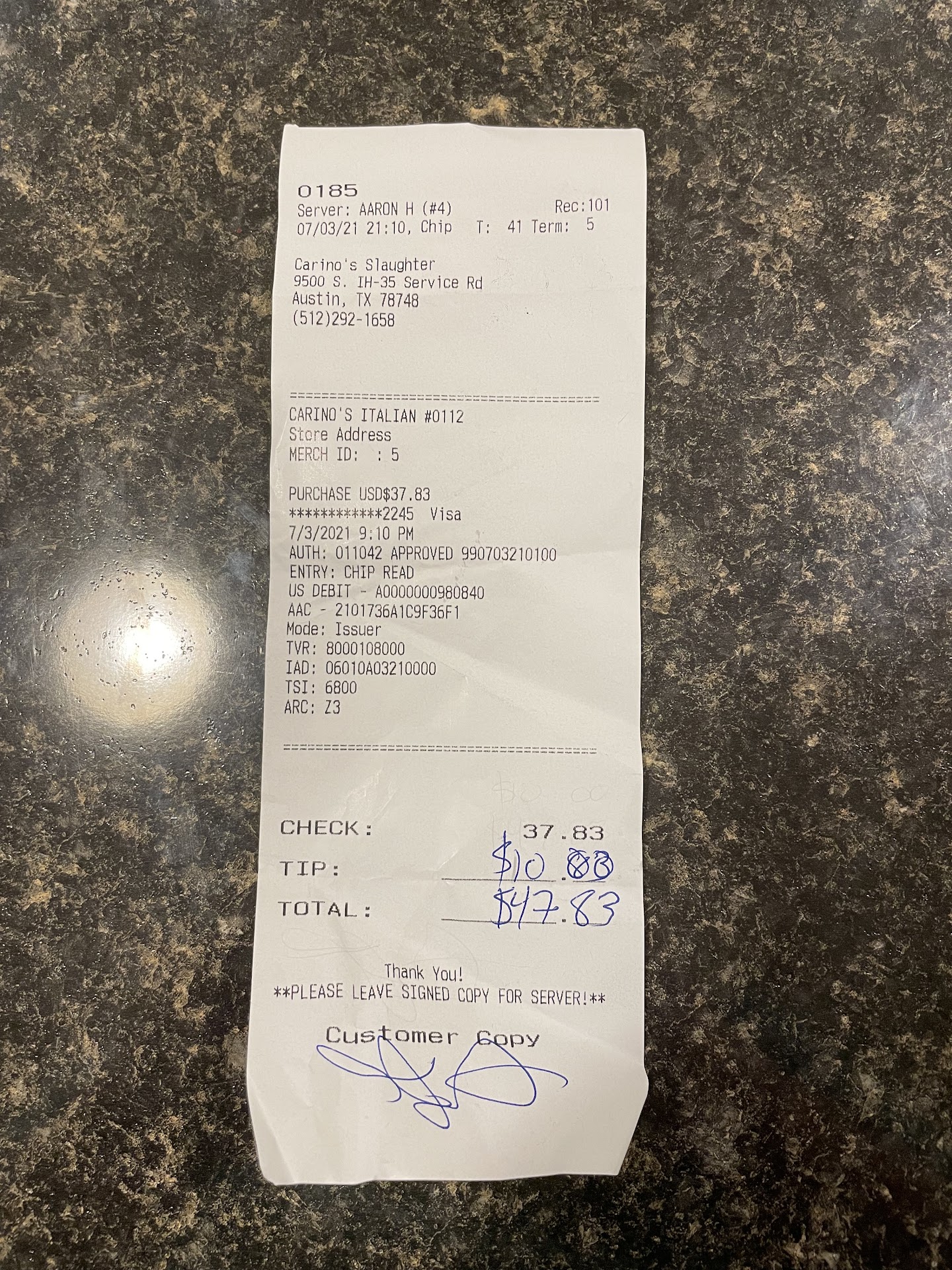 Read moreWorst experience dining here ever!!! I am pretty certain that I will never take family or friends out to dine here again. To start the host seated a party the same size as mine before me, even though they arrived after me and were placed on the list behind my party. The waiter took our orders and brought out the appetizer followed by my 4 childrenâs meals in a timely fashion. The deciding factor of this becoming a terrible dining experience was the fact that after my children completed their dinners my wife and myself hadnât received our entrees. This was a time lapse of approximately 35 minutes(I had to show the manager the 35 minutes of YouTube videos I watched @ the table). If I wanted to wait 35 minutes after my kids got their food I wouldâve gone to the Dennyâs restaurant next to the Austin airport. I asked to speak with the manager (she was also quality control for the food line), as soon as she shows up to speak with me the food we ordered magically showed up. Tried to have a professional discussion with her about the experience and she proceeded to blame the waiter. The waiter was Aaron H, and he was very polite. I defended him in saying that she was in charge of the food and not him, then she started to give me a unprofessional attitude and said âI might as well eat the food that is brought to the table otherwise they are going to just throw it away in the trash!â I responded with âI am not going to eat that food because my kids are ready to leave and I am not going to pay for a meal that mightâve been sitting underneath the heat lamp for a possible 20 plus minutesâ I hope that Corporate reads this because that manager needs to be replaced!!! I am attaching a picture of my receipt to prove this isnât a...