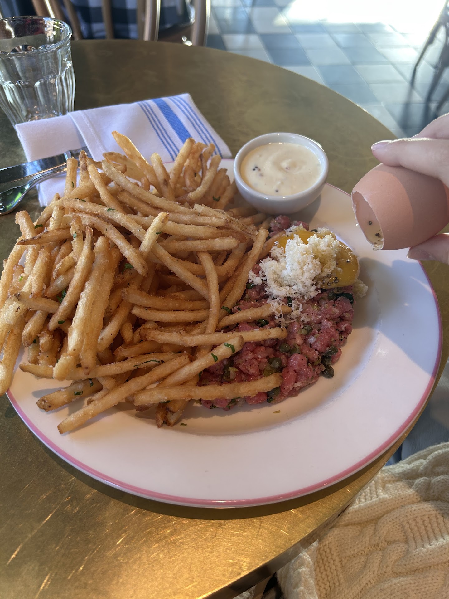 As for the food, the tartare on its own was quite good, with the capers adding a nice layer of dill flavor. However, a good slice of bread would have balanced the flavors better. The horseradish served in the eggshell, which you’re supposed to pour over the tartare, added a wasabi-like spice that was a bit too strong for my liking. The fries were perfectly crisp, and the creamy, dill-infused sauce added a soft flavor and texture to them that I really enjoyed. For the price, though, I’m not sure it was worth it—it’s about twice as expensive as other tartares.
