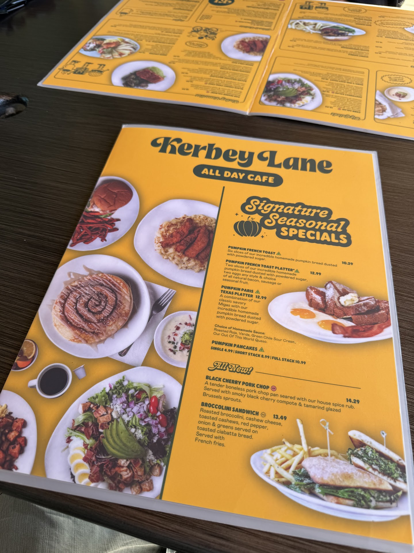 Ā Ā Ā Read moreKerbey is usually now my default if other places are closed and I need to find something filling. As sad as that is, itās a fact. It can be hit or miss mostly. The pancakes are usually pretty good. They could be way better. It depends on the cooks and manager. I took my friend before she had to drive back to her hometown. Thereās many options and fun during holidays since they change it up and add special pancakes then. Sadly, this was embarrassing. We waited a while for someone to come to the front as they all walked around like sleepy zombies. They saw us and kept walking. Finally, a girl shows up, asks how many will be dining and walks off with her tablet not saying a word. Do we follow her? No? We didnāt know what was happening. She finally comes back, grabs menus and says nothing. I guess she wanted us to follow. We sit and a waitress comes by immediately. Nothing special. She wasnāt rude either. She just didnāt care like the other girl. We ordered and she walked off. She went back to the bar where she began stuffing her face while looking at her phone. Sheād get back up to walk past the two other tables in our area and then come back and ask if we needed anything. We got our food but it was getting close to cold. The enchilada sauce had been sitting out long enough to look dried up. My friendās burger was nearly cold. Fries too. We had asked for teas and then my friend asked to change hers to a soda. She was double charged for that even though both are unlimited refills. Thatās never happened to me at Kerbey. I had also ordered a single blueberry pancake. Extremely dry. Looked that way and tasted old. What happened? They used to be fluffy and now theyāre more like a graham cracker. The waitress went back to eating again. She gave us the check and disappeared. We needed to split the check but the QR code site doesnāt allow you to separate or split. You have to ask the waitress to help you but good luck if they are done with you. Iām definitely not taking anyone to this location if at all any location. Parking is also a pain if itās busy so good luck. Thereās better places. At least it was clean until someone brought their dog in who looked to be ready to take a dump inside after he peed...