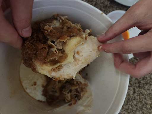 So I grabbed my bag, go on to drive home. Along the way, I figure I open up the box, and grab some fries, and lo and behold, it was room temperature. "OH HELL NO!!" I thought to myself. So checked the biscuit, also room temperature, then I check the chicken pieces. They gave me a chicked WING, not a leg, and two pieces of thighs that were maybe 10% bigger than the wing, no exaggeration, AND of course, they too were room temperature.