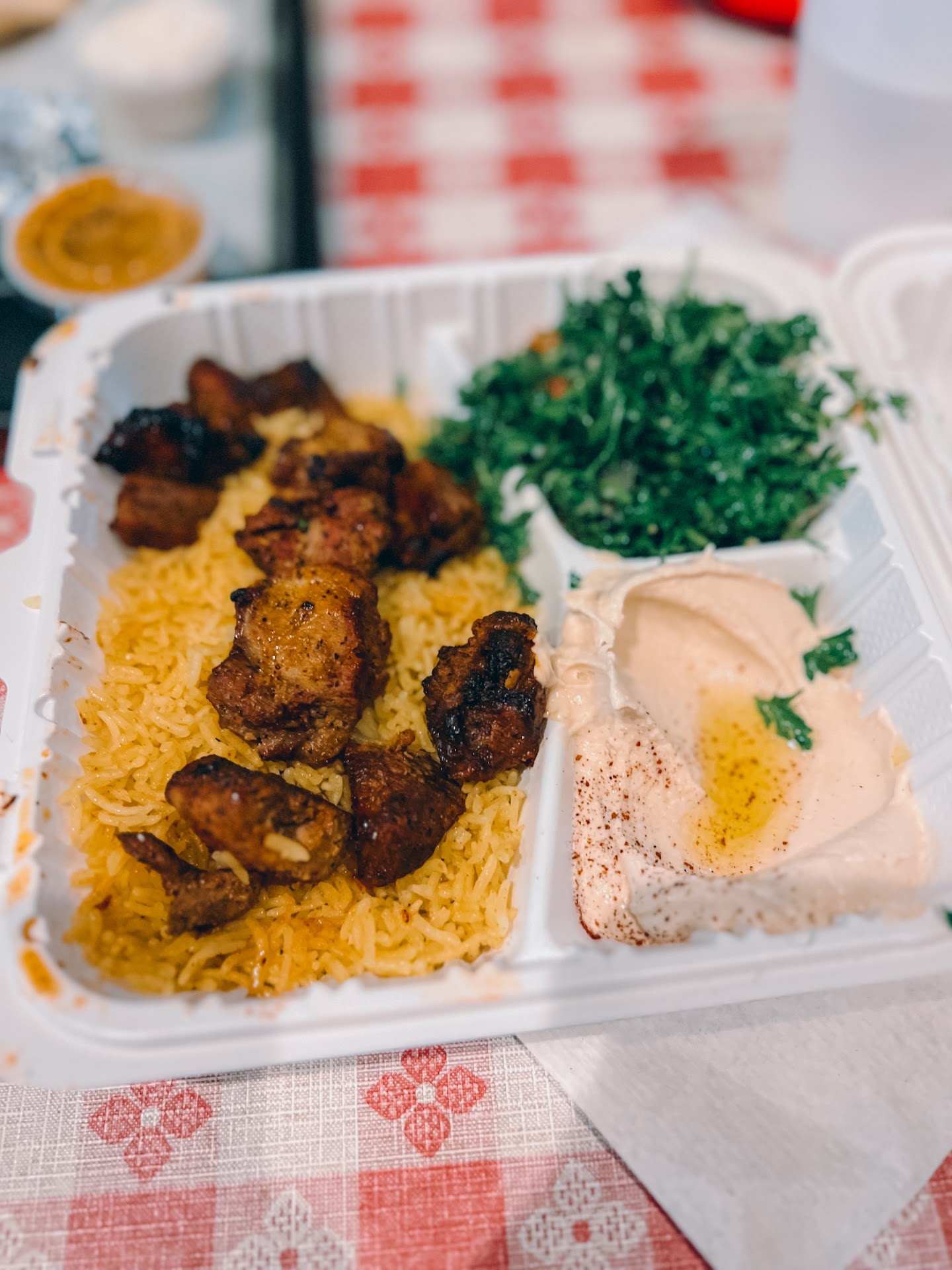 Absolute best Middle-Eastern food in the entire region! Very high quality. My favorite is the chicken shish tawook plate, which is served over rice with a side of tabbouleh salad. You can get sides of fresh fried vegetables (zucchini slices, cauliflower, eggplant) and they have a variety of delicious sauces for dipping and drizzling. My favorite is the creamy jalapeño/green sauce. They have garlic sauce, and a red sauce that's good too. The rice is a must-have, seasoned perfectly with a magical spice blend. The shish tawook sometimes takes a little while to cook, but it's worth every minute of wait. They have a variety of sides, such as stuffed grape leaves (dolmas), fries, lentil soup, and delicious baklava and desserts.