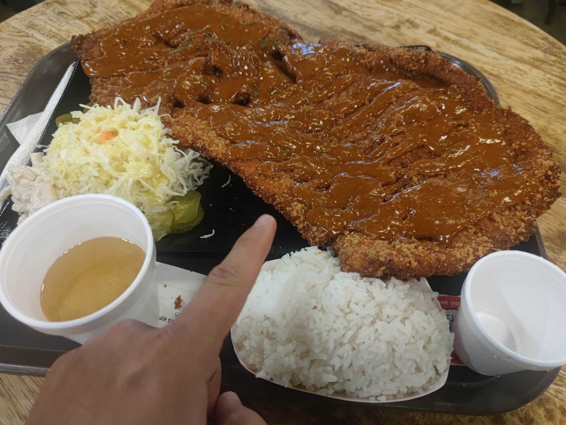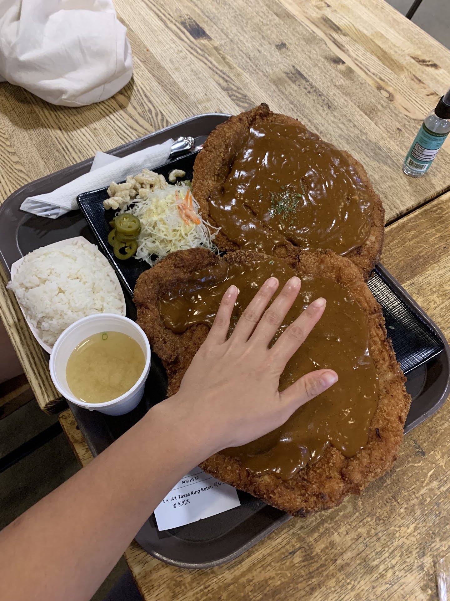 Read moreI always wanted to try the king sized Texas katsu, so I got it to share with a friend. When I went up to get it, I was pleasantly surprised that there were actually two giant katsus waiting for us. Amongst the two of us and two others who took some as well, we only finished one katsu. They blew me away with the quantity. Now for the quality part. The curry sauce is pretty necessary to have since katsu in general needs a bit of sauce. It felt more like gravy so that was interesting. The rice, slaw, and mac were forgettable.