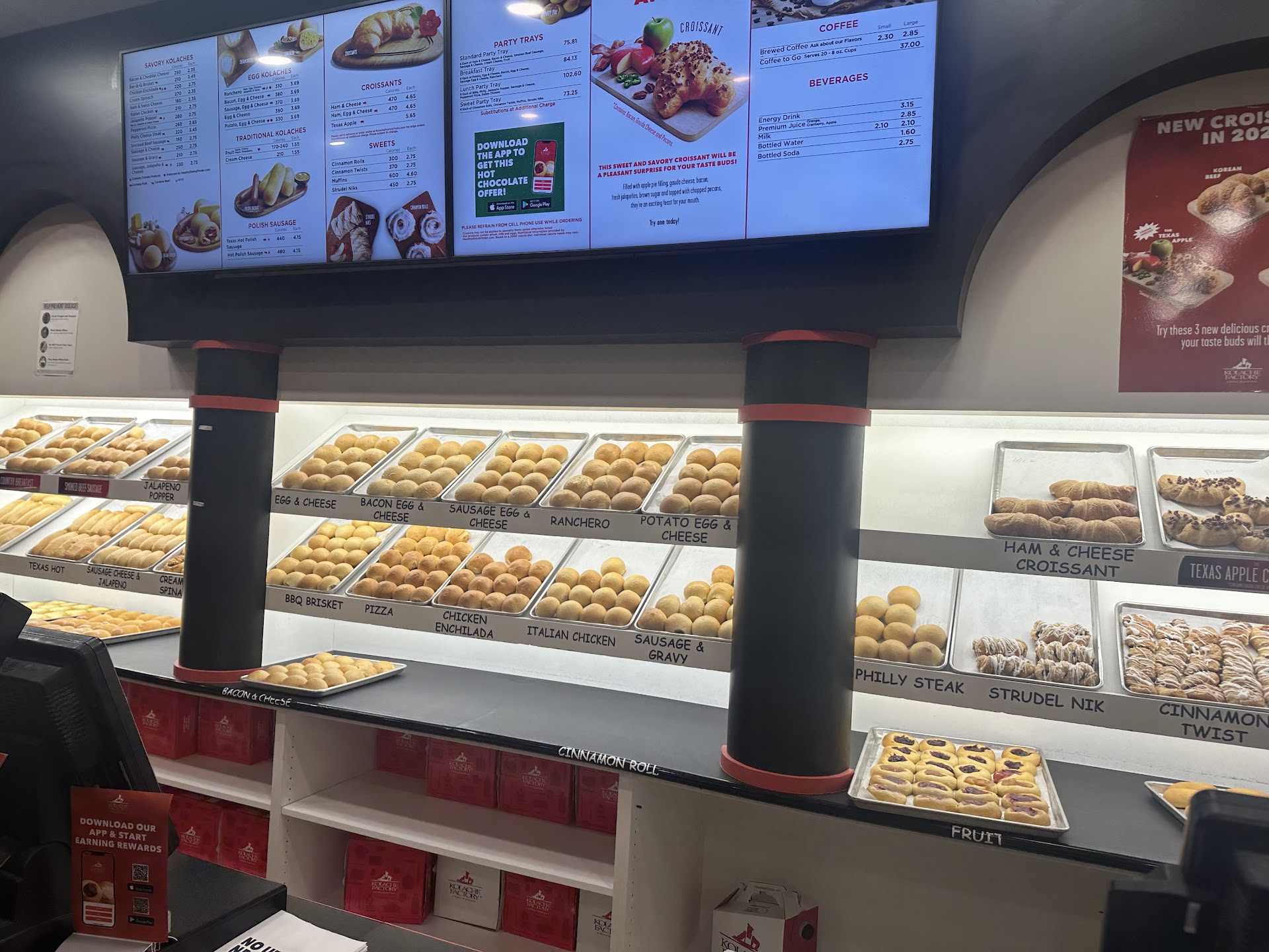 They have a large selection of kolaches from savory to sweet along with croissants. The dough is fresh, tender, and enjoyable - a good filling: dough ratio.