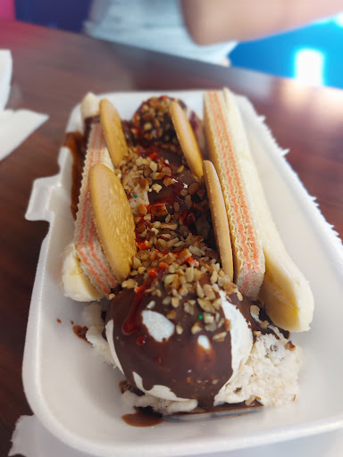 Hoy pedí un Banana Split con tres bolas de helado (chocolate, vainilla y fresa), acompañado de plátano, galletas, jarabe de fresa y salsa de chocolate. La presentación fue muy apetecible, servida en un envase para llevar. Además, hay una estación con muchos toppings y salsas (como Valentina y Chamoy) para personalizar tu postre.