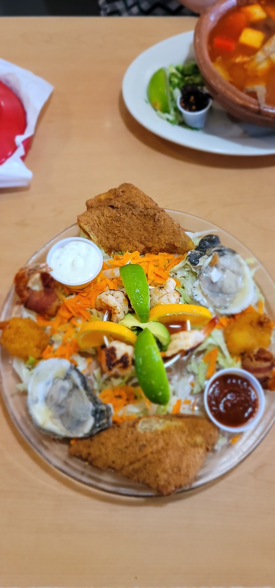The selection of different kinds of shrimp was excellent. The grilled shrimp and the bacon wrapped were definitely my favorite. There were 2 catfish fillets that were ok. The fish tasted good but the batter was odd and thick. I don't do oysters by my wife said they were oysters. It came with no other types of sides - no rice, beans, guac, coleslaw. My wife loves the spiciness of her soup. Lots of shrimp and imitation lump crab. There were also a whole lot of mussels and clams and probably octopus. Not her favorite selection in those other items, especially as overwhelming as they were. But if you love that selection this soup would be...