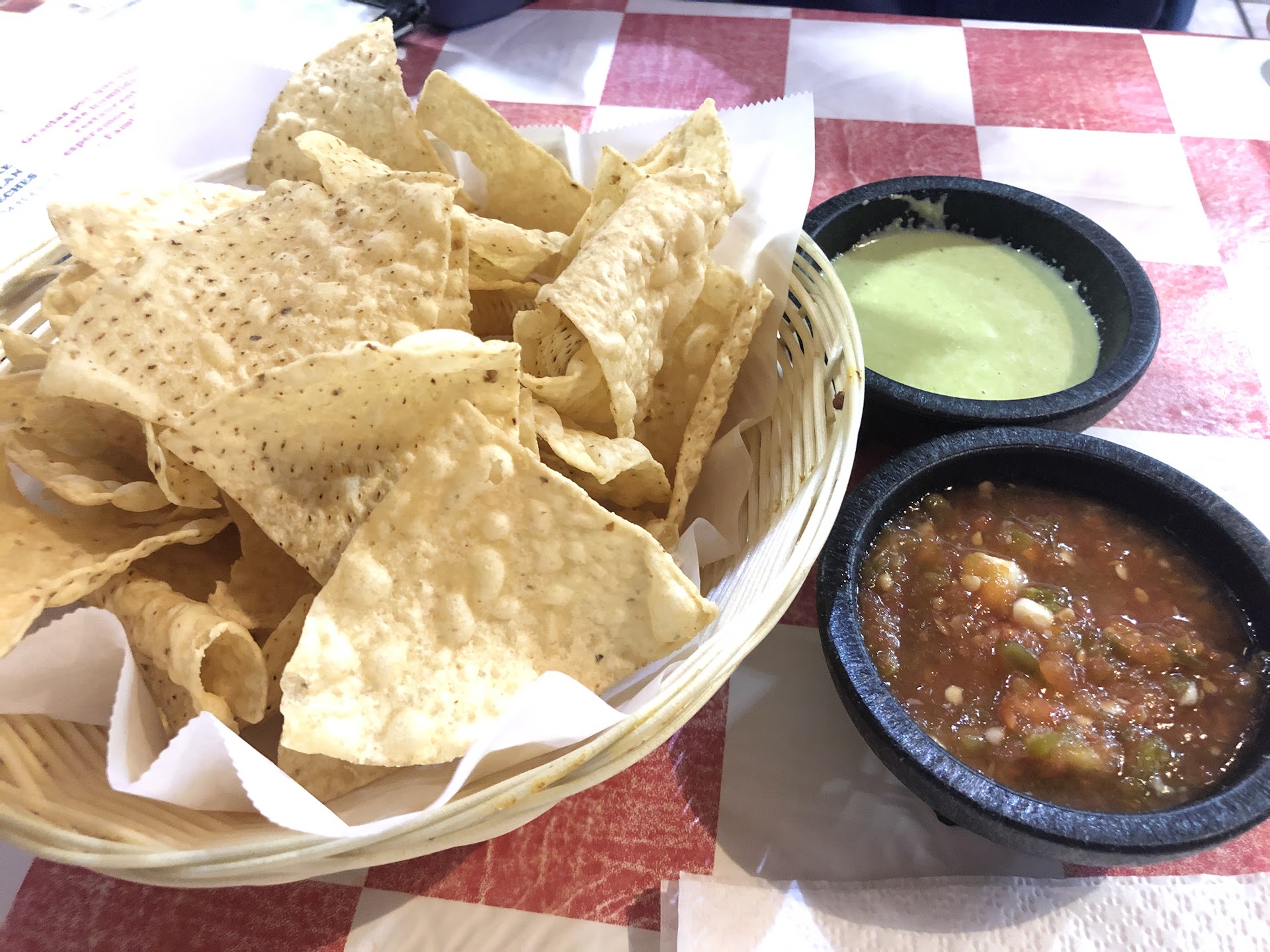 They started us off with chips and salsa. The red salsa was watery tomato and bland. The green sauce was thick and spicy fantastic.