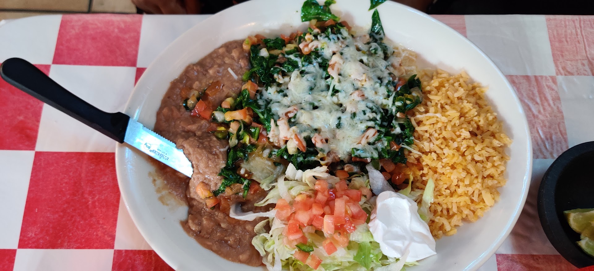 She ordered the Spinach Enchiladas which consisted of cheese enchiladas with a generous amount of spinach topping with rice and refried beans (which may or not have been vegetarian), salad and guacamole. The guac was pretty bland but it was pretty late at night.