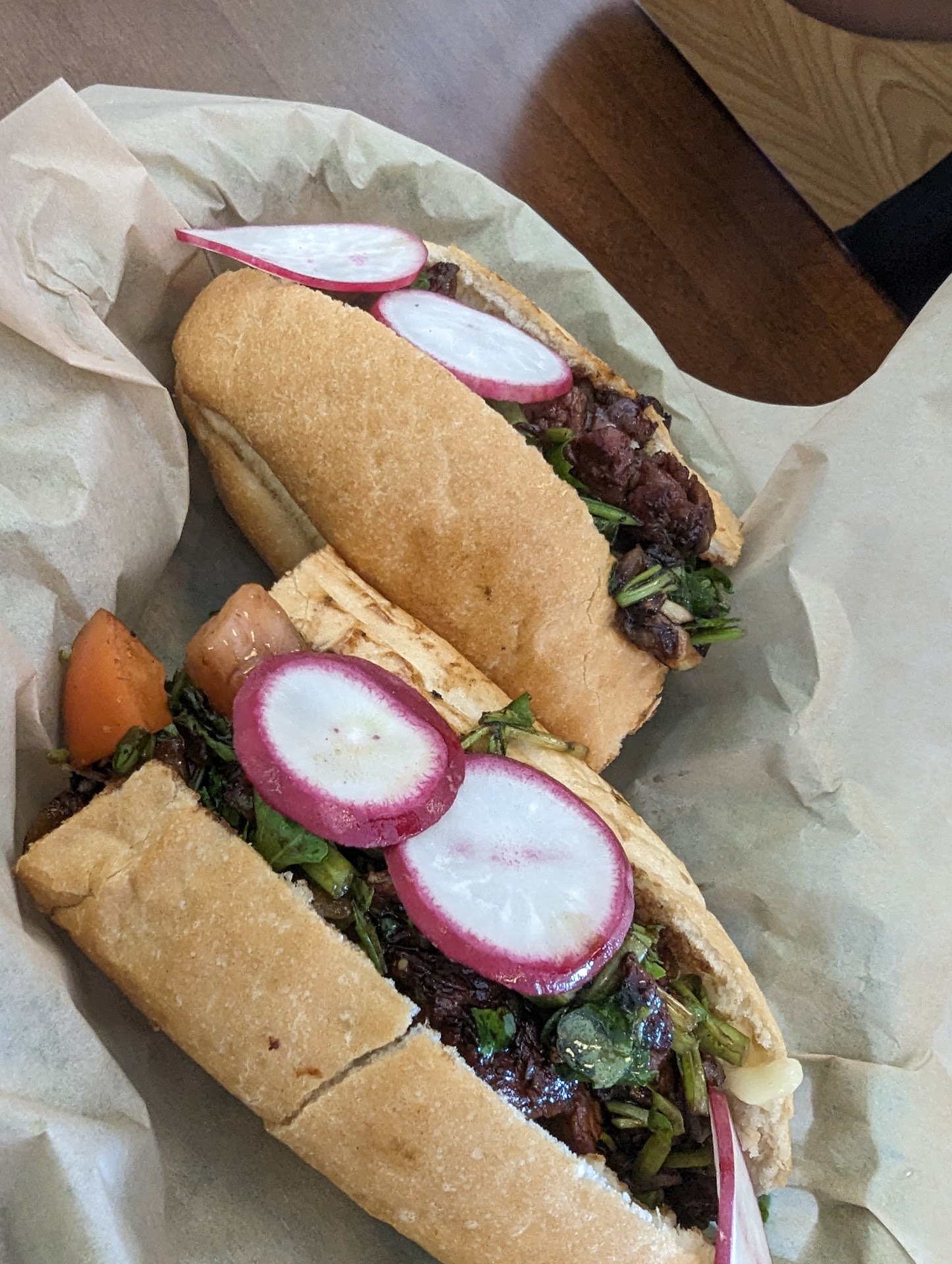 Read moreThe interior has a cool vibe to it. There's a few booths, but most of the place is just a few long tables with chairs on each side. It's great to meet people that way. When I went I got the chicken banh mi sandwich and the fried egg rolls. The egg rolls were average, but the sauce they came with made them above average. The egg rolls were crispy and flaky, and the filling was tasty, but it looked like mush. The bahn mi was tasty. The bread had lots of flavor, so did the veggies in it (carrots, jalapeños, cilantro). The chicken thighs were perfectly cooked, but they were a little too sweet for me. Also, the chicken thighs were in large pieces, so when biting into the banh mi, I'd end up pulling some of the fillings out instead of getting a clean bite. All in all, these are minor complaints.